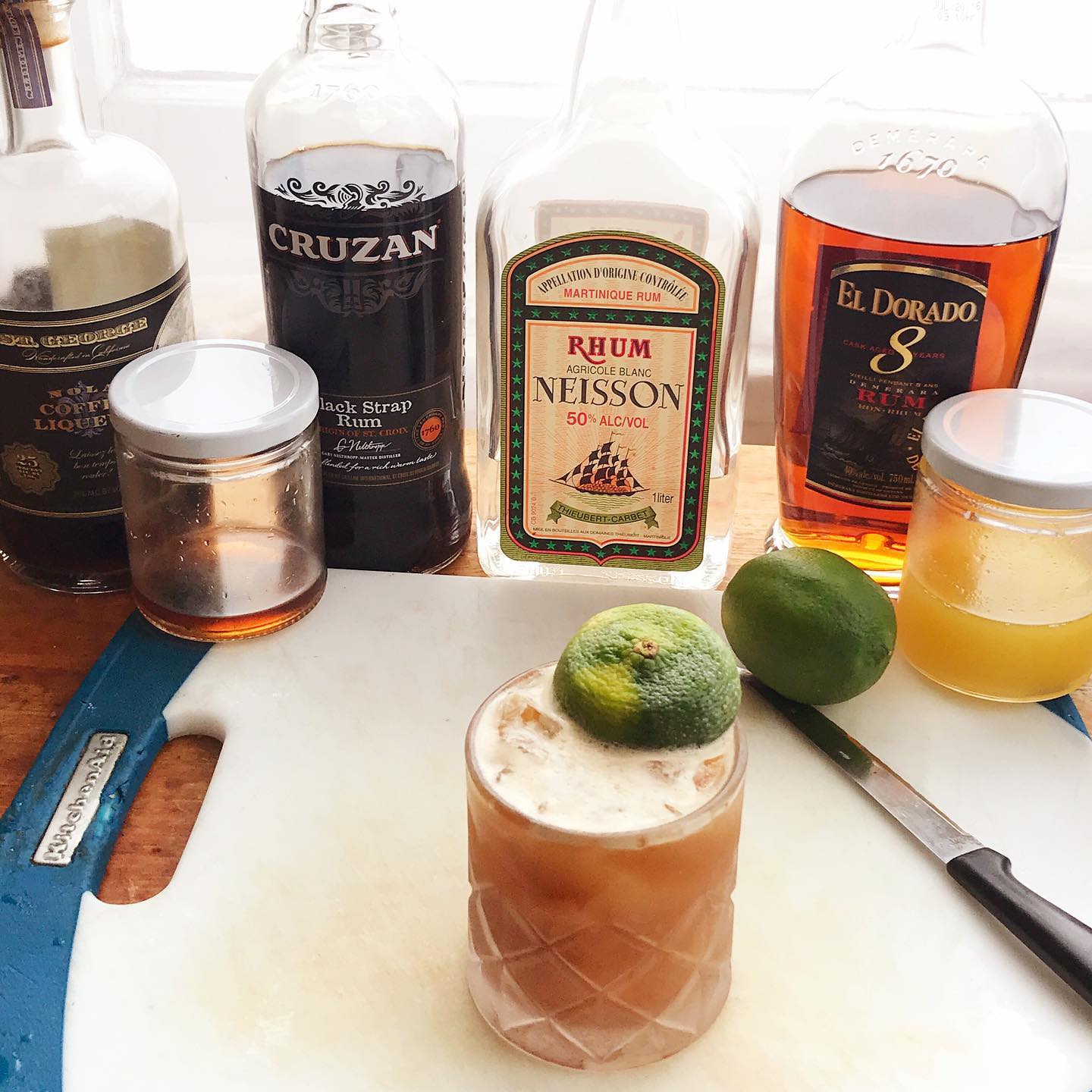 A refreshingly funky riff on the coffee + Tiki classic cocktail Mr Bali Ha’i from Chicago’s Lost Lake 🏝☕️🍍 The grassy sugarcane notes of the unaged agricole mingle with the caramelized sugar notes of the aged Demerara rum and the molasses notes in the blackstrap rum to create an intriguing flavor base that works well with both the coffee flavors and the tropical pineapple and citrus. Delicious balance of tropical, bittersweet, and refreshing