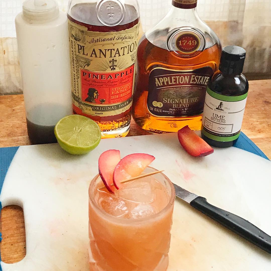 The sweet/tart notes of the pluot (can also use a plum) are boosted by the Ume bitters and complemented by the tropical pineapple flavor from the Stiggins Fancy Rum and the tropical aromas and molasses notes in the Jamaican Rum (also a great flavor pair with stonefruit) while the lime ensures things don’t get too sweet