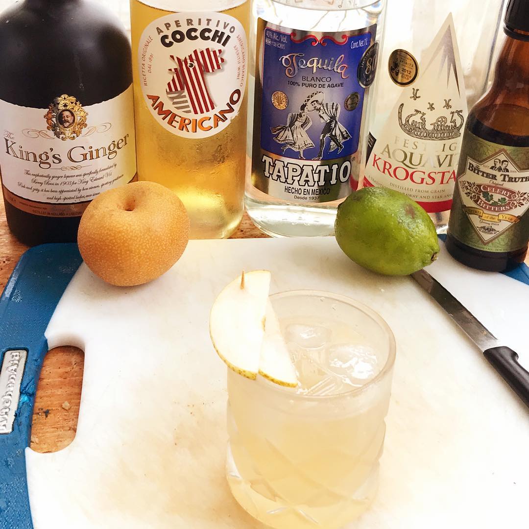 The hybrid apple/pear low acidity sweetness of the Asian Pear is boosted by the fresh agave flavor of the unaged tequila while the aquavit brings a complementary anise note and the ginger and chamomile/white wine notes from the liqueur and Cocchi Americano add complementary flavors. The touch of lime juice gives a touch of acidity while the bitters boost the spice notes of the aquavit and ginger liqueur