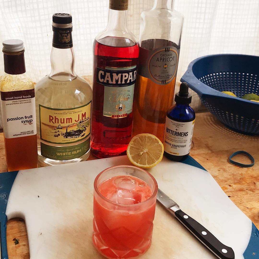 The passion fruit, apricot, and lemon combine to give a complex and tart fruit flavor while the Campari and hopped grapefruit lend a refreshing bitterness. The Agricole brings a bit of grassy funk and the pinch of salt makes all of the flavors pop