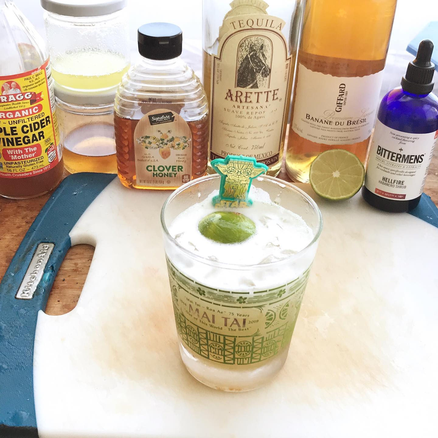 A funky yet delicious riff on a Mai Tai from NYC’s Shannon Mustipher that brings some south of the border influence to the party 🍍🌶🇲🇽 The earthy funk notes in the reposado tequila work well with the banana and fermented pineapple (tepache is mimicked here by fresh pineapple juice and apple cider vinegar in 2:1 ratio) while the butterscotch flavors in the tequila work well with the cinnamon and salted honey syrup. The lime helps balance the acidity and the bit of Habanero adds a touch of heat to the finish