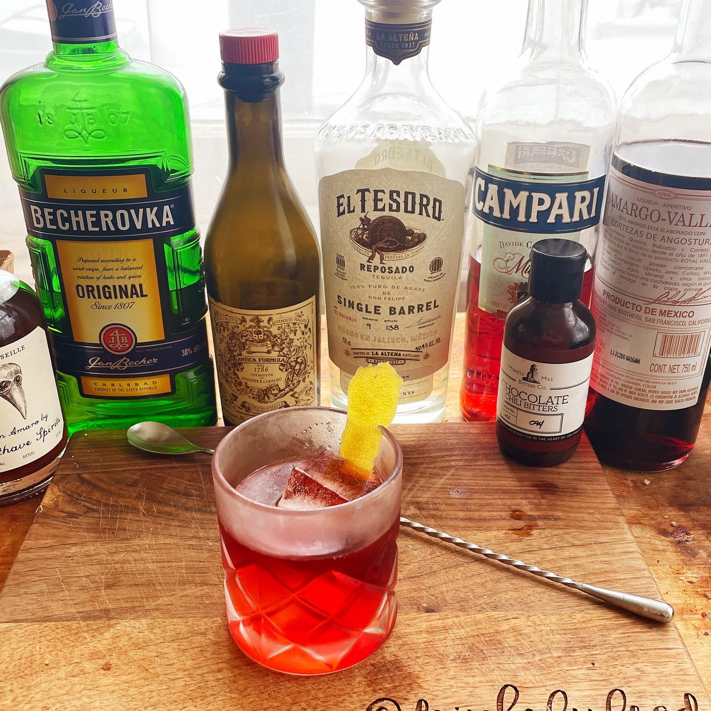 The baking spice and citrus zest notes in the Reposado tequila work in harmony with the cinnamon and light bittersweet notes in the Becherovka to offer some bold flavors to stand up to the grapefruit pith notes of the Campari and the bittersweet combined with cherry cola notes of the Mexican amaro. The sweet vermouth offers some cocoa and vanilla notes that work nicely with the honey/eucalyptus notes of the Forthave Marseille Amaro to offer body and additional bittersweet notes. A dash of chocolate mole bitters helps boost the cocoa and baking spice notes