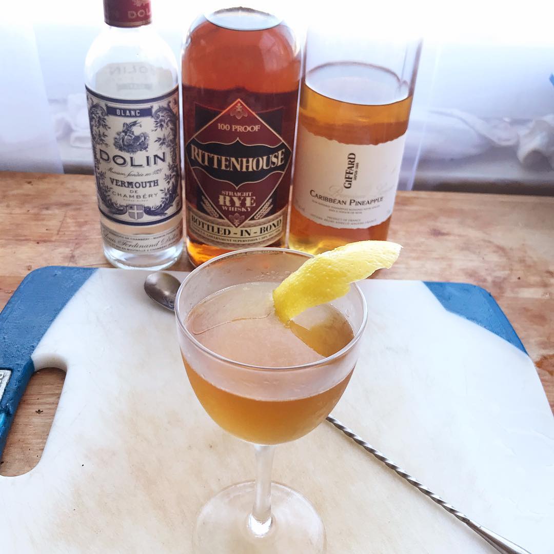 The replacement of the pineapple juice with pineapple liqueur (or gomme syrup) and the Dry Vermouth with Blanc Vermouth fixes a problem in the original with acidity, background spice, and sweetness. The baking spice and oak in the Rye now balance nicely with the chamomile notes of the Blanc vermouth and the roasted pineapple flavors of the liqueur with tasty results. The oils from the lemon twist lend a hint of juiciness