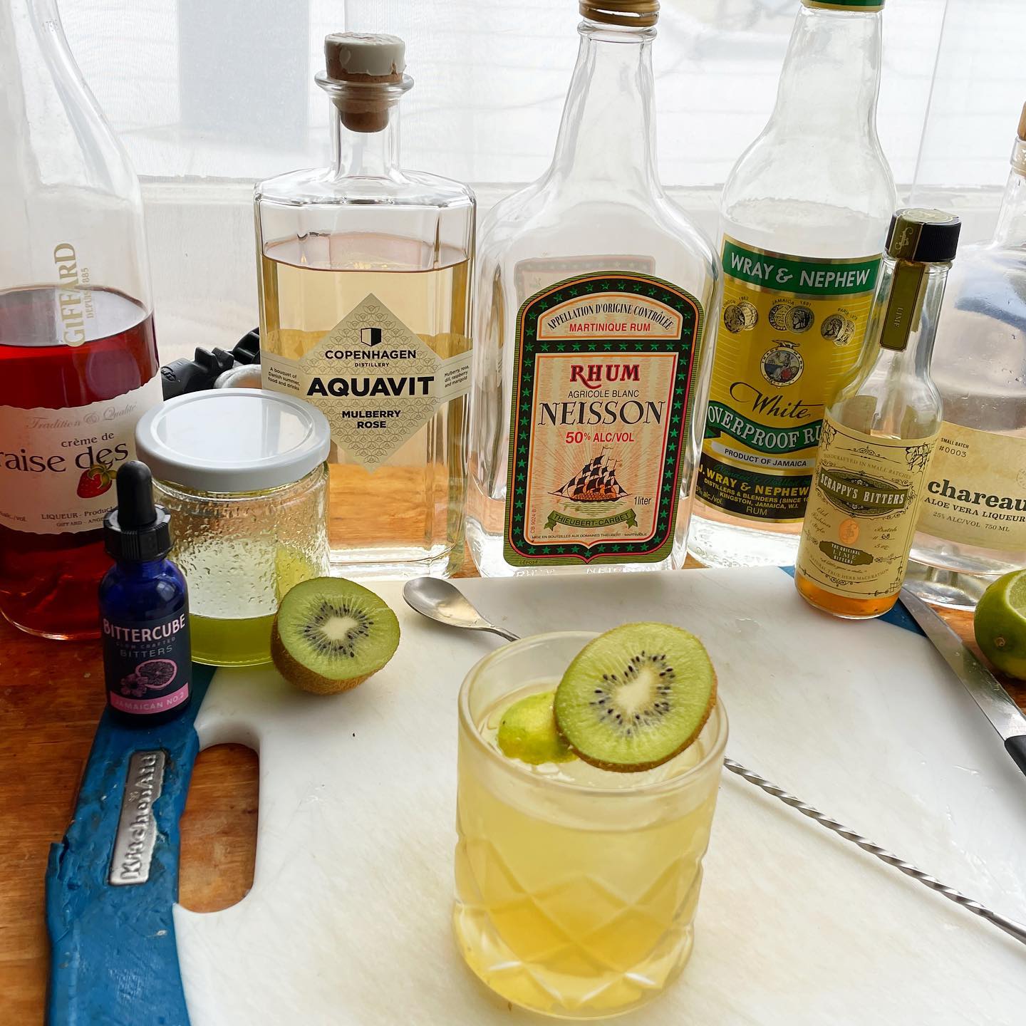The unaged agricole rhum brings notes of grassy sugarcane that combine with the tropical fruit aromas and funk in the overproof Jamaican rum and the floral and spice notes in the infused aquavit to create a flavorful base. Kiwi syrup and splashes of strawberry liqueur and aloe liqueur (with notes of cucumber and green melon) add some complementary fruit notes while the lime and hibiscus/grapefruit bitters and bit of lime flesh and zest gives a bit of citrus aroma and freshness