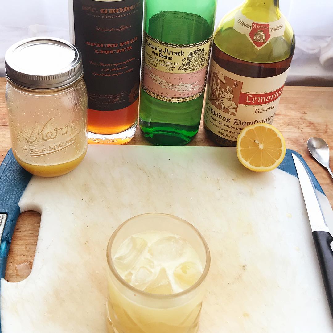A nuanced, delicious Tiki punch filled with fruit, baking spice, and some ginger bite from NYC’s Shannon Mustipher (her recent book, Tiki: Modern Tropical Cocktails is stuffed with great ideas/recipes!) 🍐🍎 The dry, fruity notes of apple in the Calvados pairs nicely with the funky, spiced proto-rum Batavia Arrack. These flavors are bolstered by the ripe pear and baking spice in the liqueur, the brightness of the lemon juice, and the bite of the ginger syrup. Makes a delicious punch if scaled up from the recipe below