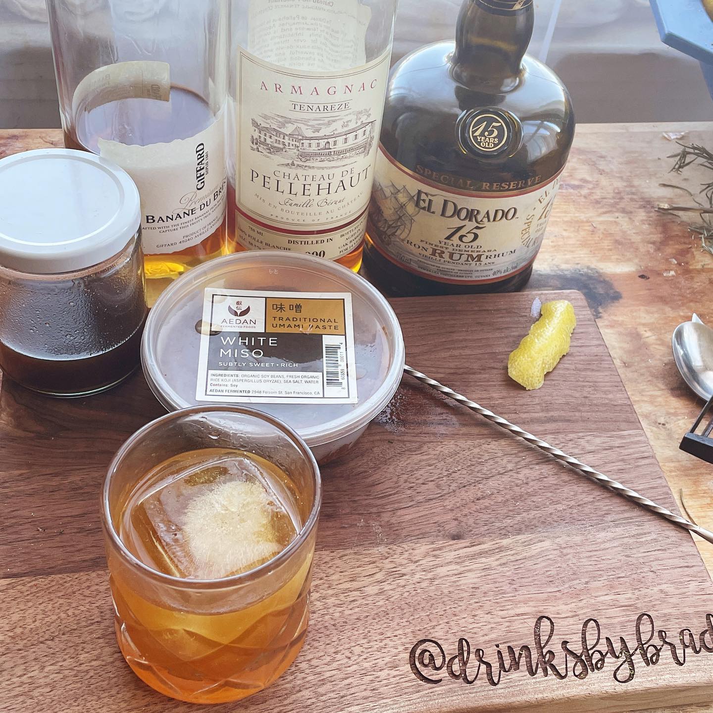 The roasted fruit notes and caramelized sugar notes in the Aged armagnac combine with the molasses and brown sugar notes in the rum to form a flavorful base that accentuates the funky/umami/slightly sweet and butterscotch like notes in the white miso (used in a syrup) and the roasted tropical fruit notes in the banana liqueur. Delicious!