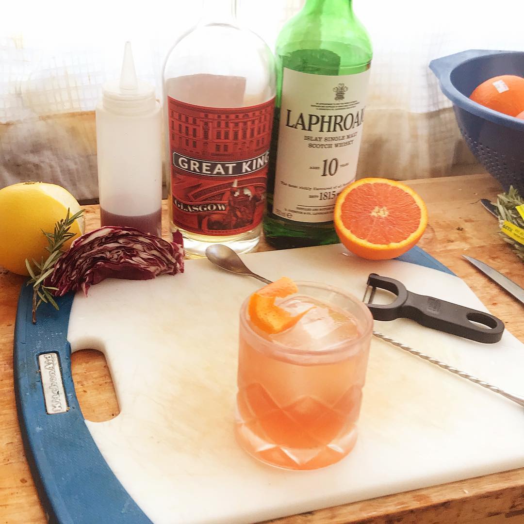 Stir with ice and strain into a double rocks glass with a large ice cube. Garnish with an orange twist *Mix 1/4 cup granulated sugar with 1/2 cup water, stir until dissolved. Add about 1 cup of chopped radicchio (about half a head) and simmer 20 minutes on low heat. Add 2 grapefruit twists and 5-10 fresh rosemary leaves, simmer 5 more minutes. Let cool 10 minutes and then strain, pressing on solids to expel all syrup, store in refrigerator