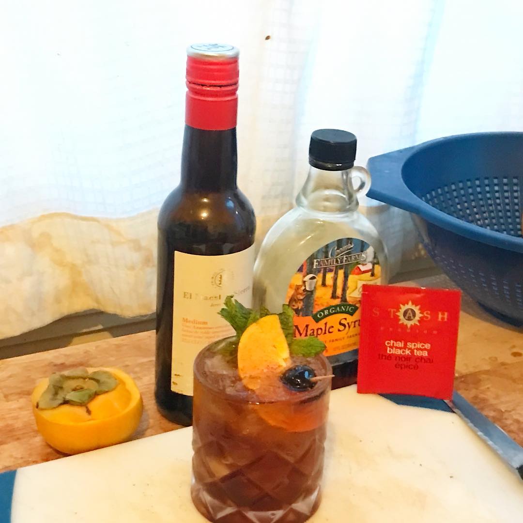 The chai tea-maple syrup adds spice and sweetness to the nutty sherry while the garnish is aromatic and tasty