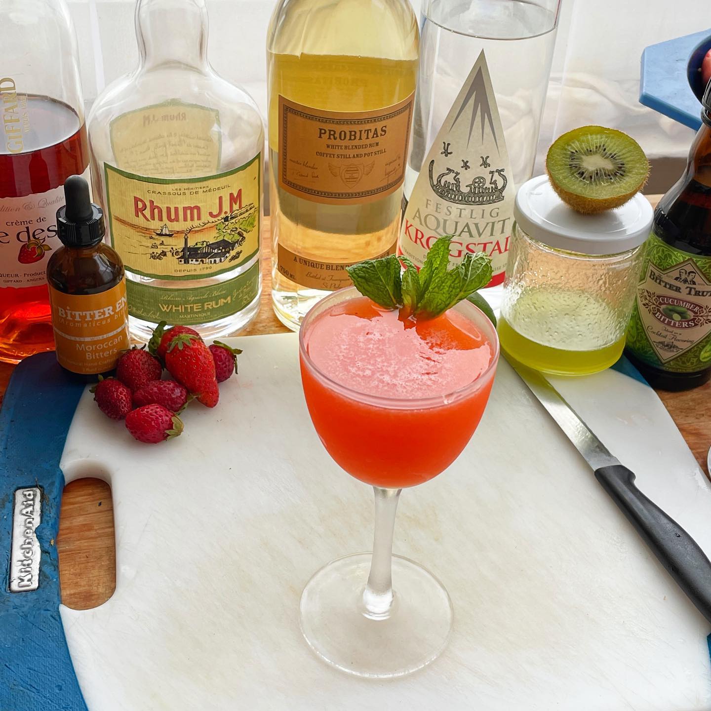A refreshing, summer-themed riff on a Strawberry Daiquiri with some complementary herbal and spice notes 🍓🥝🥒🍹