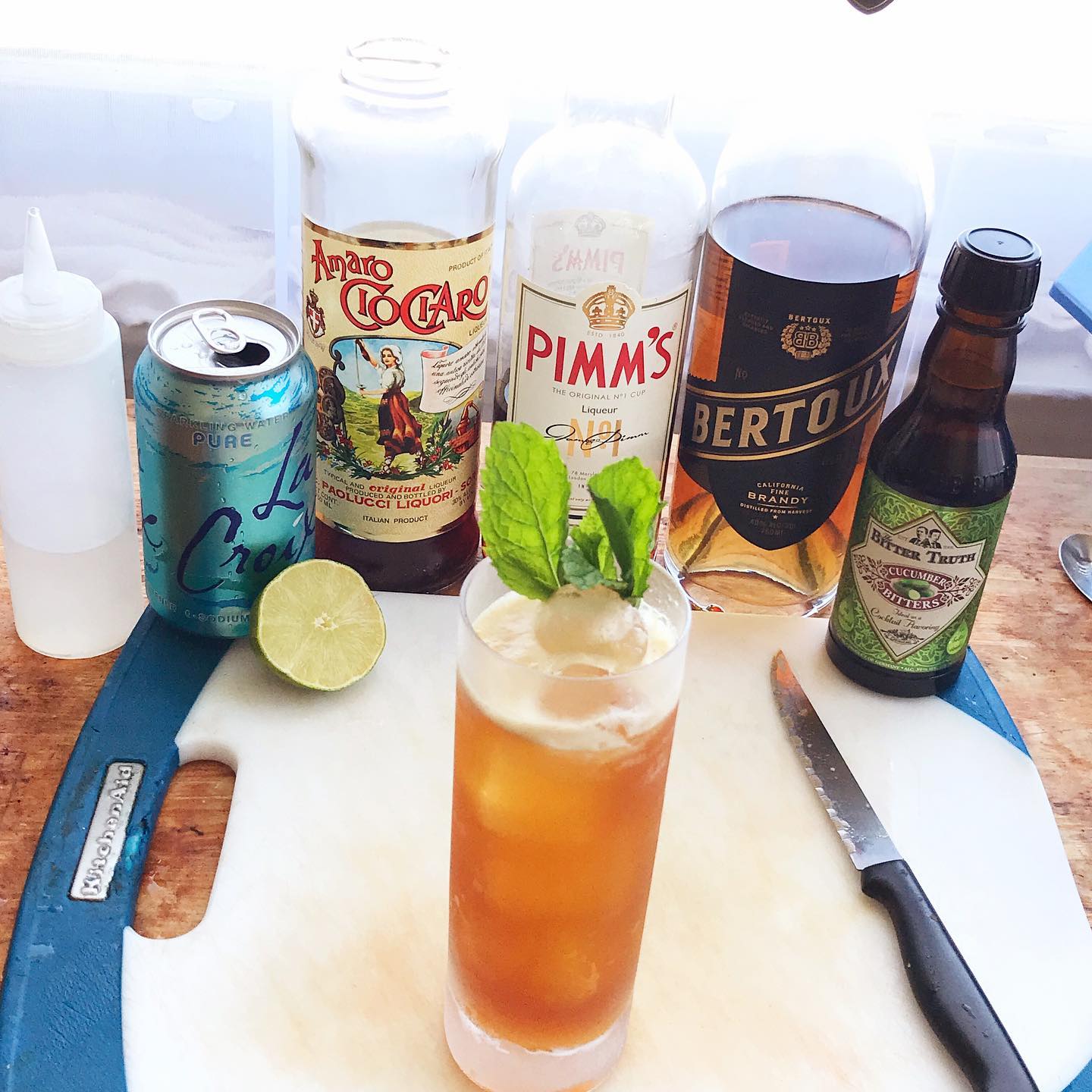 The botanical, spice, and fruit notes in the gin-based Pimm’s #1 provide the base flavors while the brandy gives the drink a bit of oomph while reinforcing the fruit notes. The splash of amaro adds a bittersweet note and a hint of orange peel, the lime provides needed acidity, the soda water some effervescence, and the cucumber bitters/mint highlight the botanical/herbal notes in the Pimm’s. Very refreshing