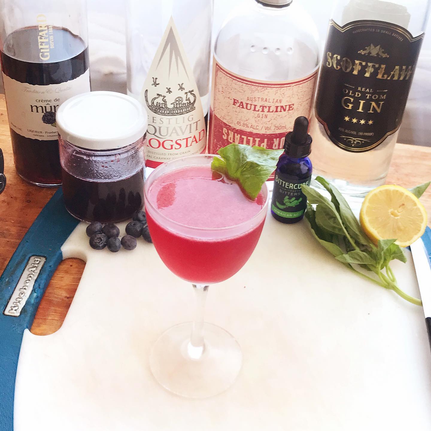 A flavorful blueberry syrup (boosted by a splash of berry liqueur) works beautifully with the bright lemon juice and aromatic fresh basil and the botanical notes in the blend of gins to create a very pleasant melange of garden flavors. The addition of some aquavit adds complementary star anise notes and the bitters contribute notes of ginger and allspice that tie everything together
