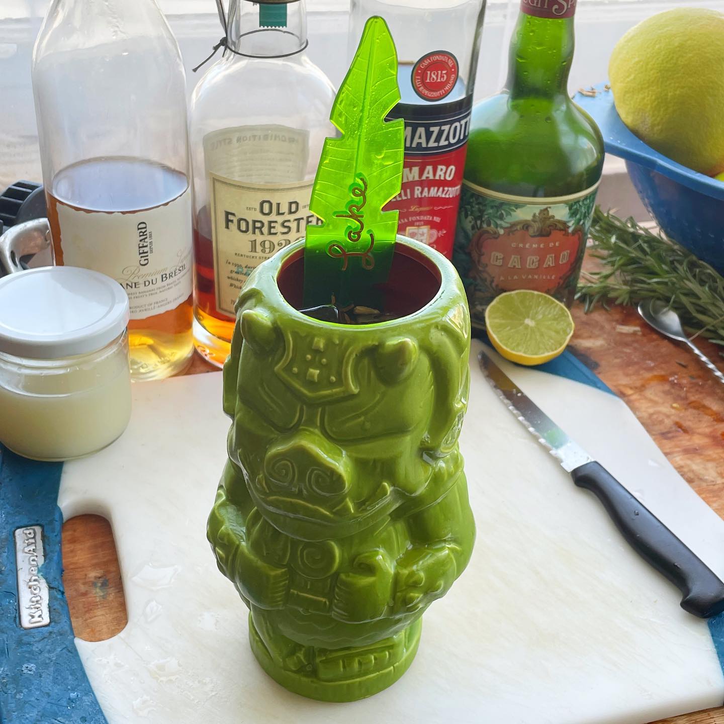 A tropical, yet bittersweet riff on a Sour/Tiki Punch from Al Sotack with notes of tropical fruit, citrus, and dark chocolate 🏝🍹🍍🍌🍫
