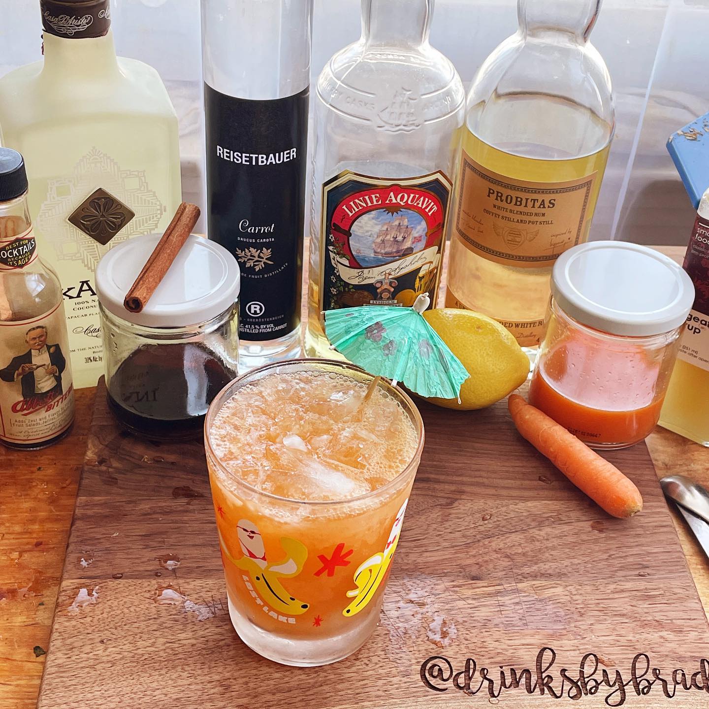 The caraway and baking spice notes in the aged aquavit combine with the citrus zest and pot still funk in the blended rum to form a base that accentuates the sweet carrot flavor in the Eau de vie and fresh carrot juice. Creamy/nutty orgeat and a splash of coconut liqueur help add body and nuance that stands up to the fresh lemon juice. Cinnamon syrup and aromatic bitters add some complementary spice notes. A delicious concoction!