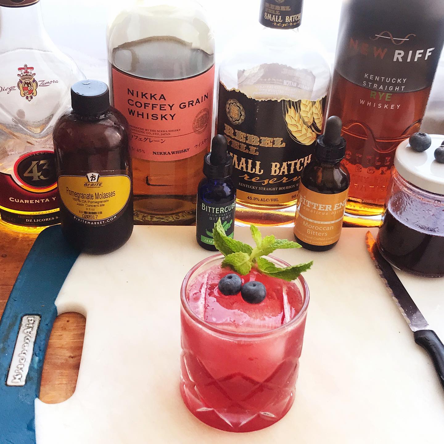 The blend of bourbon, rye, and Japanese grain whiskies brings flavors of caramelized sugar, vanilla custard, and a hint of cinnamon and baking spice that works really nicely with the fruit notes in the blueberry syrup. The fresh lemon juice balances the drink with bright citrus notes while the pomegranate molasses (grenadine also works) adds depth to both the berry and tart elements in the drink. The vanilla liqueur underscores the vanilla notes in the whiskies and the bitters add notes of warming spice and ginger. Delicious!