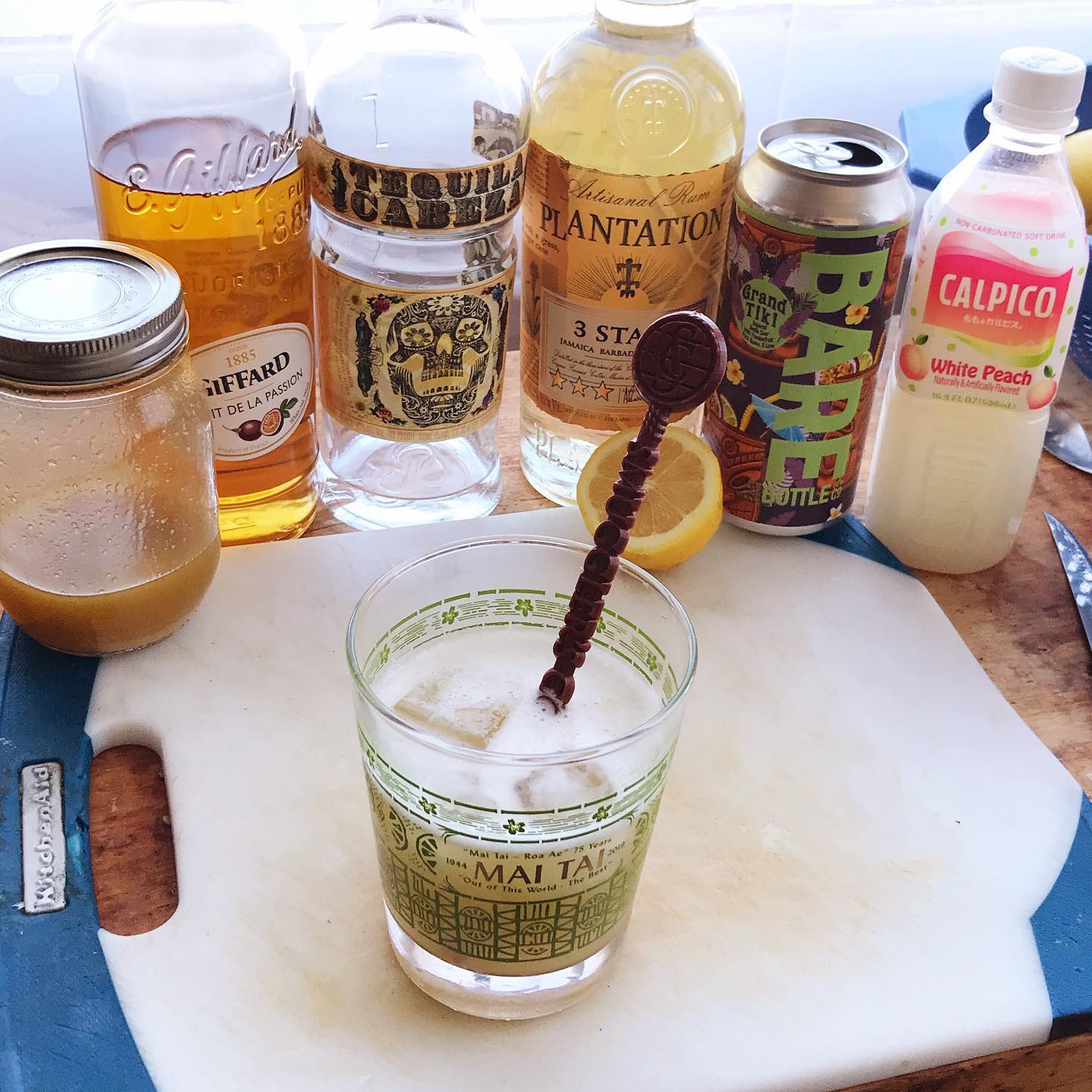 A refreshing beer cocktail/hybrid riff inspired by Ignacio Jimenez’s Burro Tropical with a tropical kettle sour swapped in for club soda 🏝🗿 The citrus notes in the tequila and tropical fruit/caramelized sugar notes in the blended rum provide a flavorful base that works nicely with the fresh ginger spice and the sweet/tart passion fruit. The Calpico has a mild tang that helps bridge the citrus and beer with the other flavors while also giving a texture closer to a pina colada. The guava and passionfruit notes in the beer boost the tropical fruit notes