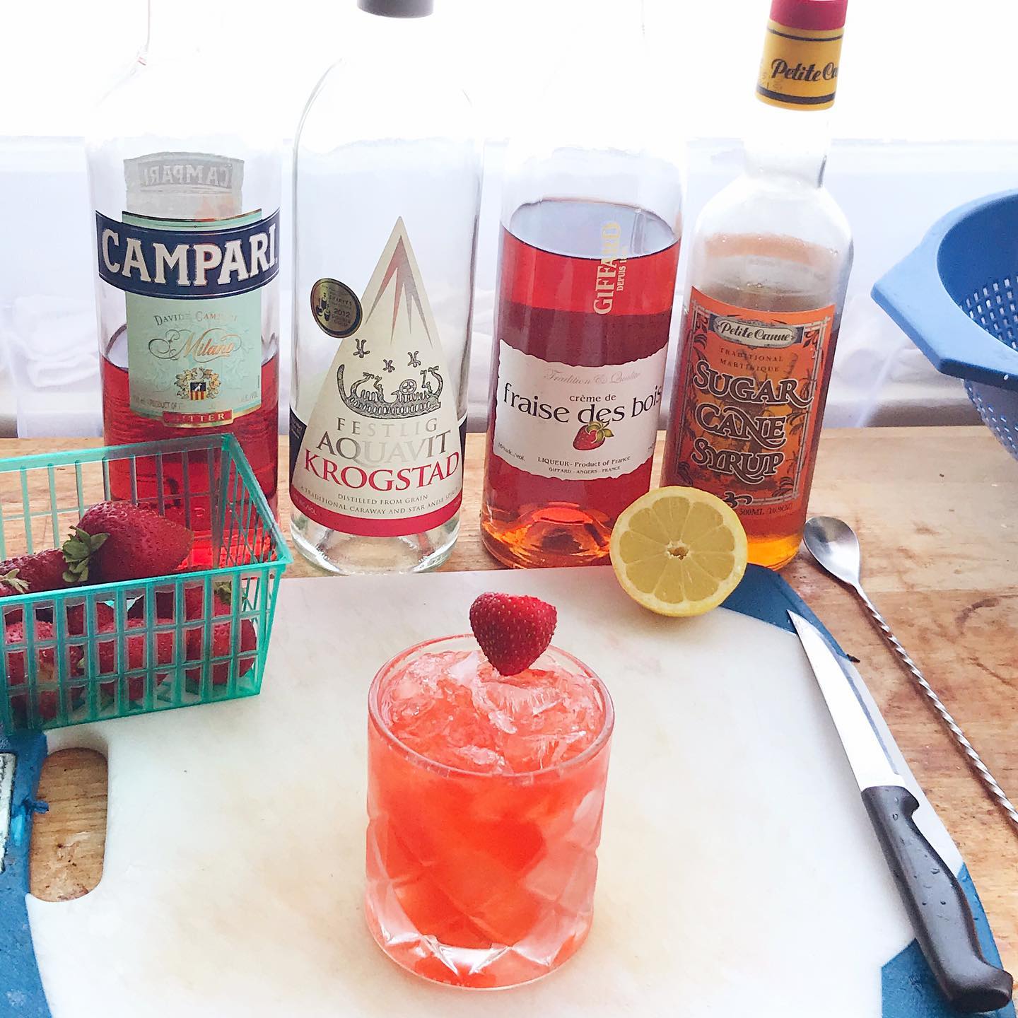 The flavor of the ripe strawberry is boosted by the bit of strawberry liqueur and cane syrup and is very complementary with the juicy notes in the bittersweet Campari, the anise and spice notes in the aquavit, and the tart lemon juice. A bit of orange flower water adds a fragrant note