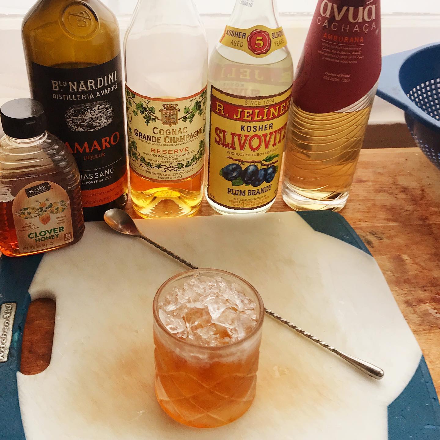 The fruit notes in both the cognac and aged cachaca work very nicely with the plum Eau de vie (or slivovitz) to produce a pleasant, rounded fruit flavor that works nicely with both the honey and the peppermint and chocolate notes of the Amaro Nardini. A very refreshing after dinner sipper