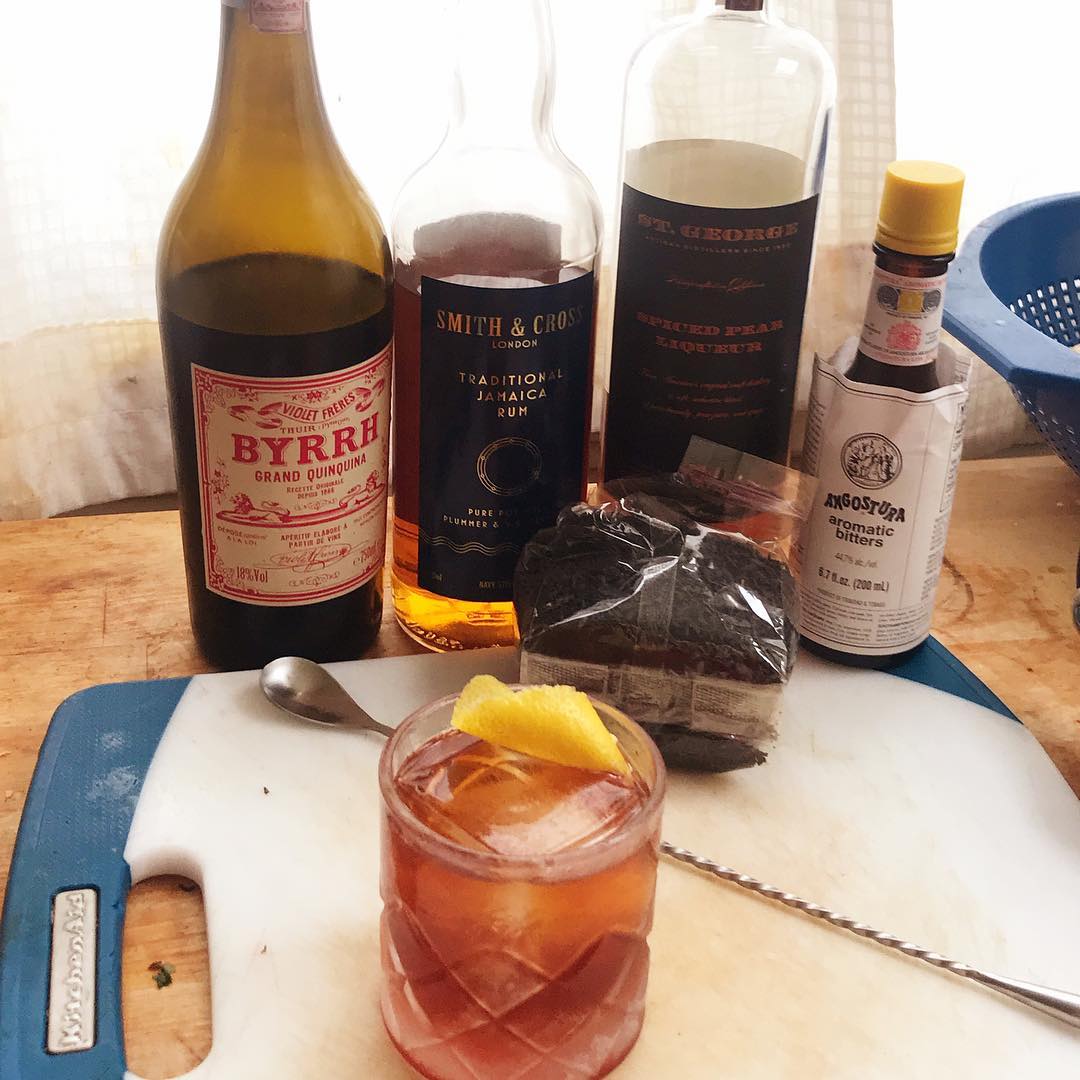 The pear flavor is united to the funky, tannic tea-infused rum via the grapey, slightly bitter Byrrh. The essential oils from the lemon twist ratchets everything up another notch. A definite modern classic
