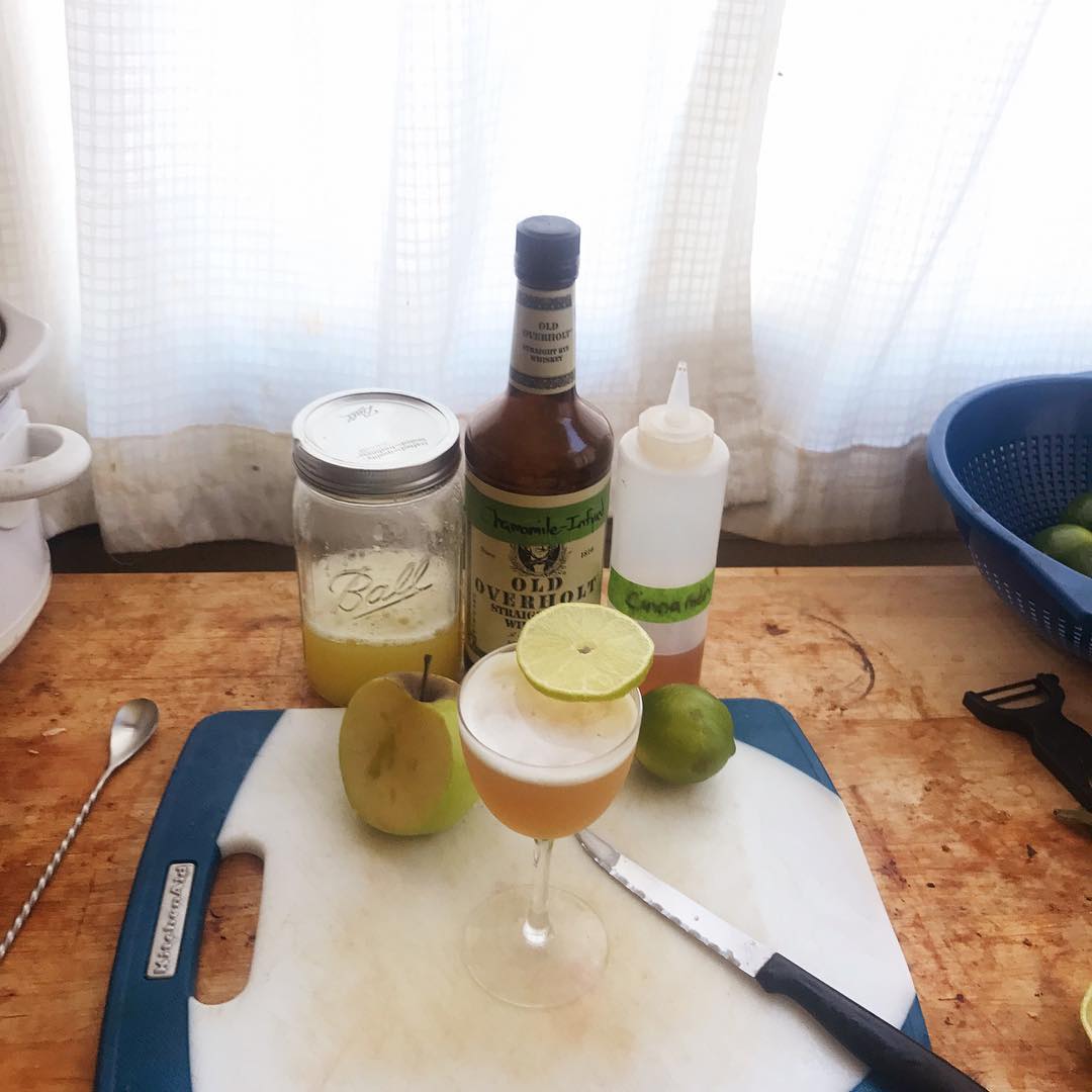 The chamomile-infused Rye and cinnamon syrup provide the spice notes while the muddled apple and pineapple offset the tartness of the lime