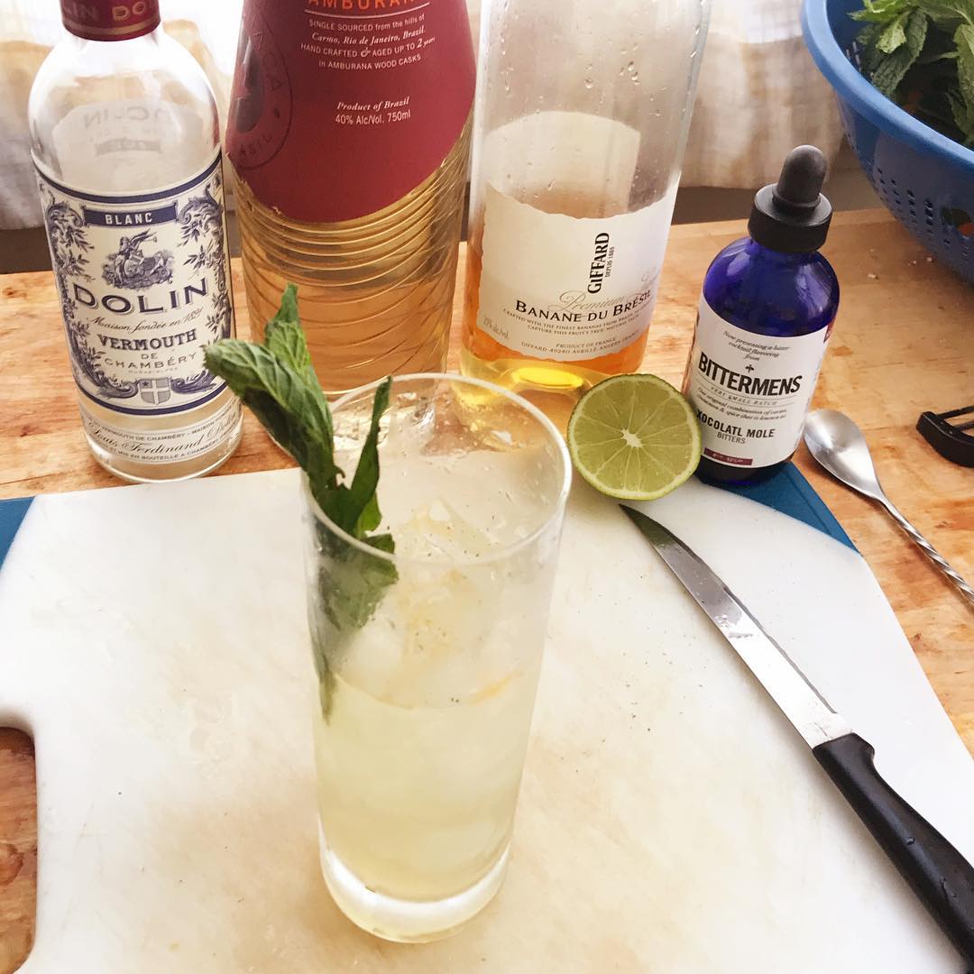 The roasted banana flavors in the liqueur mingle nicely with the softer chamomile and botanical flavors from the vermouth and the spice and sugarcane notes from the barrel aged cachaca. A bit of lime brings needed acidity and the mint garnish brings a pleasant aromatic quality .75 oz Aged Cachaca (Avua Amburana or Novo Fogo Barrel Aged)
