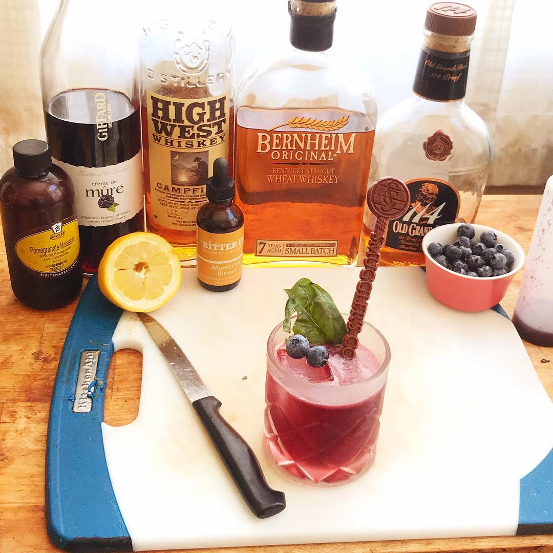 The more caramel and vanilla forward notes of the wheated bourbon anchor the drink while additions of Overproof Bourbon and High West’s delicious Campfire blend add oomph and a hint of smoke. These flavors merry beautifully with the blueberry syrup and lemon while the blackberry liqueur reinforces the berry notes and the pomegranate molasses adds a touch of nuanced sweet-tartness