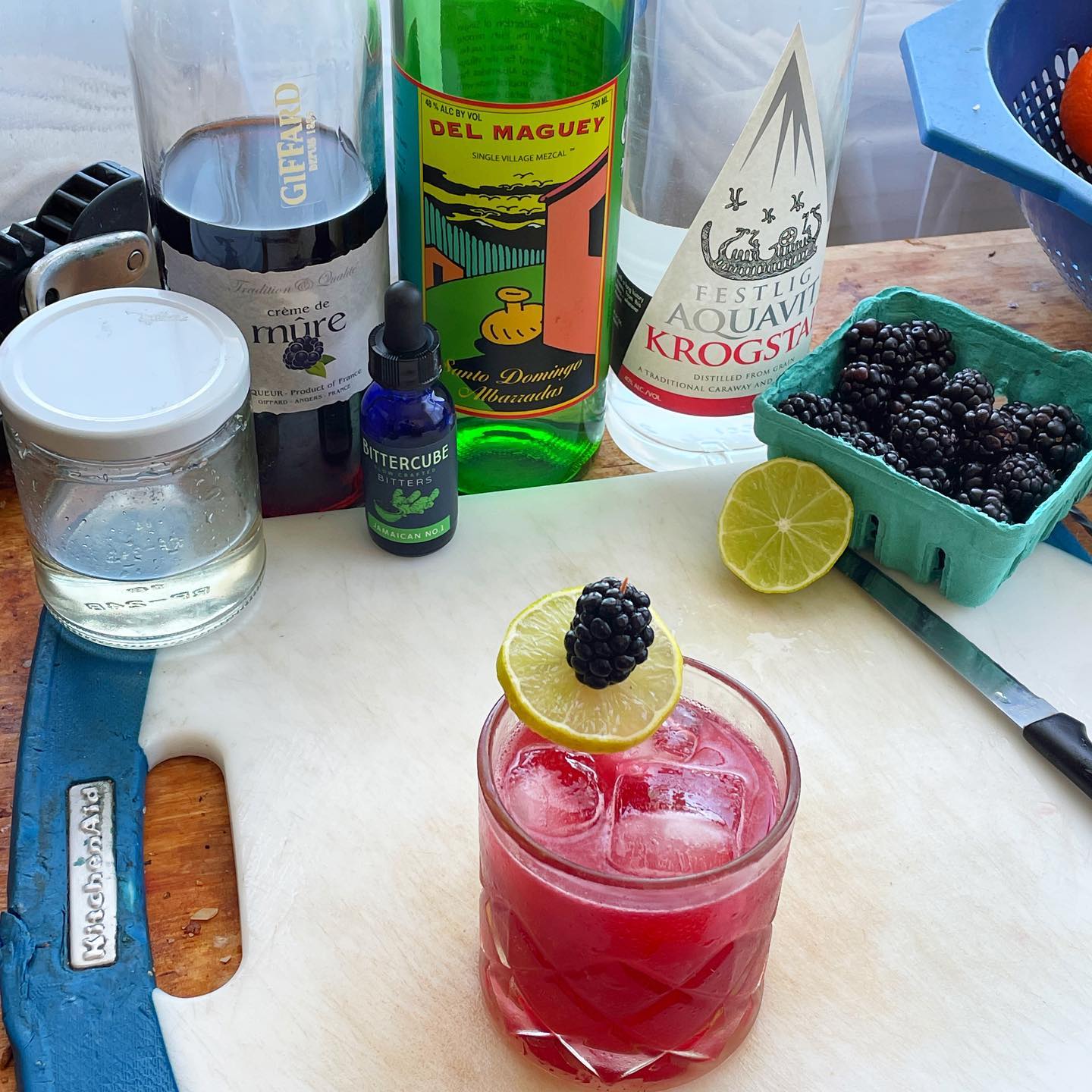 The blend of Mezcal and Aquavit creates a base with notes of citrus zest, star anise, and a touch of smoke that works really nicely with the jammy sweet/tart notes from the liqueur and fresh blackberries while the bright, tart lime juice helps brighten and balance the drink and the dash of ginger and allspice-forward bitters boost the spice notes. Delicious!