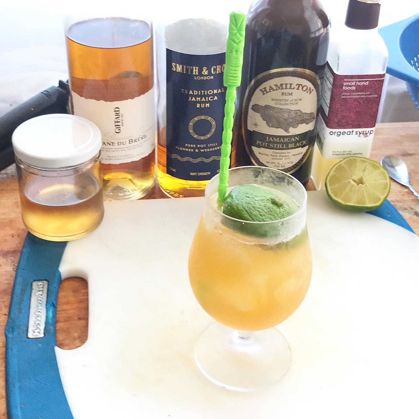 A funky, spiced riff on the classic Mai Tai from excellent bartender Fanny Chu of Brooklyn bar Donna that would pair nicely with a short stack 🥞🍌🍹🏝 The ripe tropical fruit aromas and molasses notes in the blend of pot still overproof and Jamaican dark rums works brilliantly with the brûléed banana notes in the liqueur, the cinnamon syrup, and almond notes of the orgeat. The lime juice lightens and brightens the drink