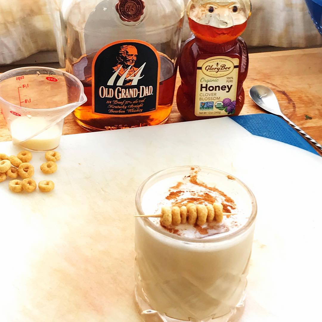 Shake with ice and strain into a chilled double rocks glass with an ice cube or two. Garnish with a pinch of freshly grated cinnamon and Honey Nut Cheerios on a pick