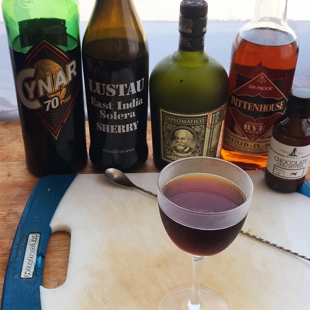 The brown sugar/molasses notes in the rum integrate very well with the oak and baking spice of the rye whiskey while the cream sherry adds notes of toffee and the Cynar brings an important undercurrent of bittersweet flavors. The bitters add hints of chocolate and chili spice