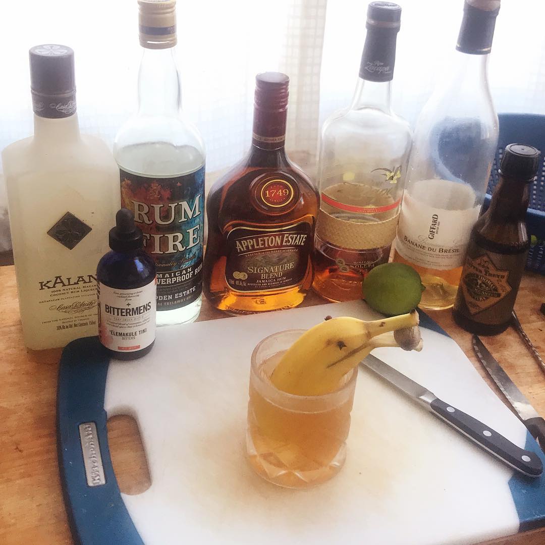 1 dash Bittermens Elemakule Tiki Bitters (cinnamon and ginger)* Shake with ice, strain into chilled double rocks glass. Garnish with a banana dolphin (take stem half of banana, cut stem and 2 inches into flesh for mouth, add cloves above slit for eyes, insert nutmeg or brandied cherry in mouth) *used in place of spiced rum; omit if using that