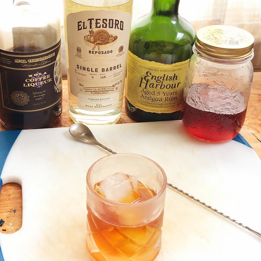 The butterscotch notes of the reposado tequila and the molasses notes in the aged rum help carry the caramelized, bittersweet flavor of the burnt sugar syrup and the coffee liqueur to result in a fantastic after-dinner drink