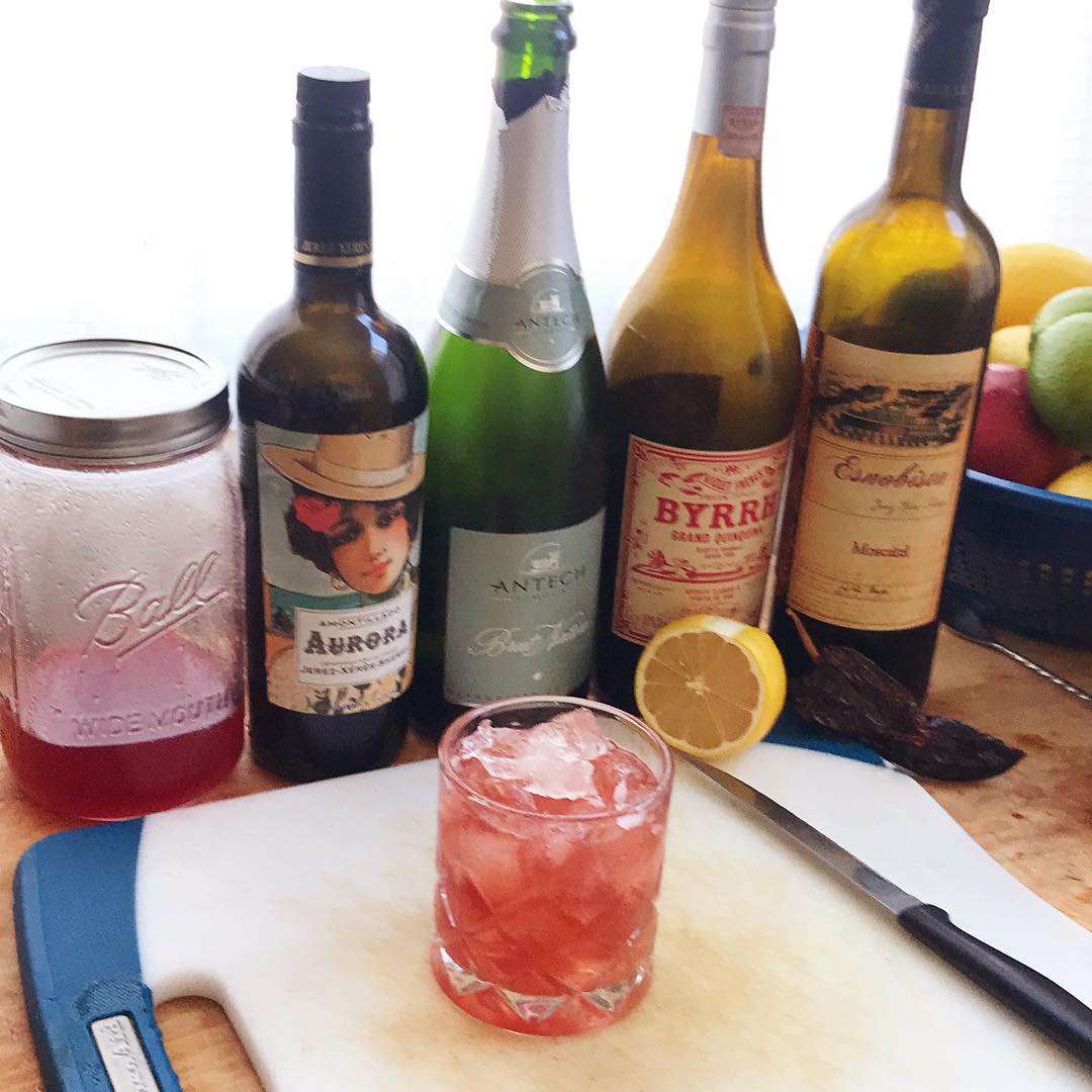 A mix of earthy, nutty sherries with tart, fruity notes from the fortified wine with quinine Byrrh and cranberry shrub topped with tasty sparkling wine. Very refreshing, yet also warming .75 oz Byrrh (grape mistelle based fortified wine with quinine)