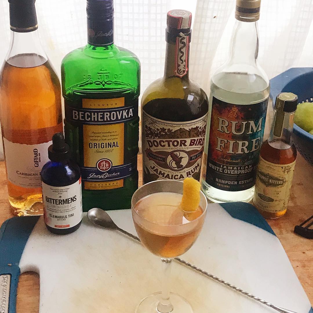 The Doctor Bird provides a nice base with some vanilla and caramelized sugar notes that work really well with the brûléed pineapple flavor from the liqueur and the cinnamon from the Becherovka and Tiki bitters. The funky overproof rum gives a kick and enhances the tropical aroma and work with the lime bitters to dial down the sweetness