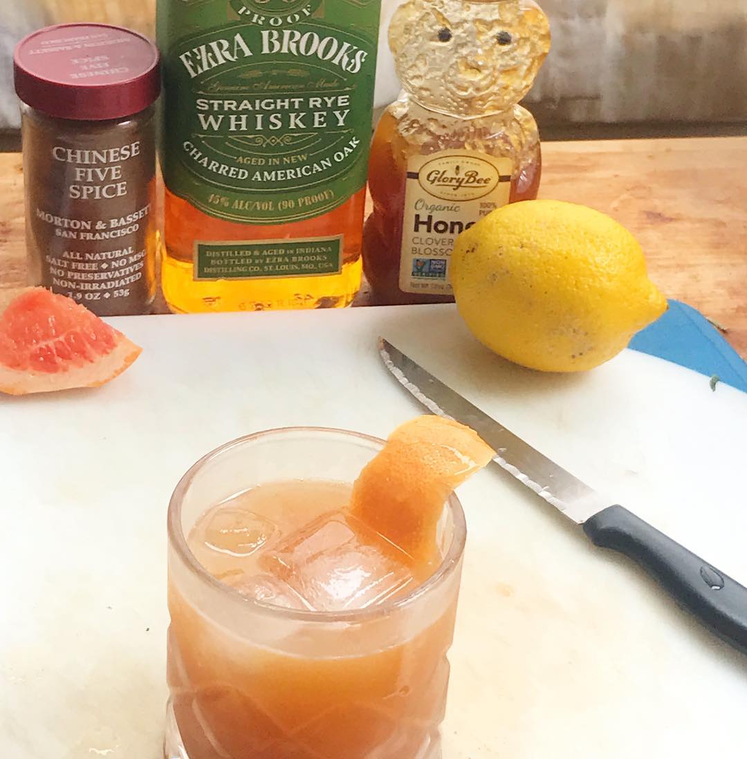 The addition of the fivespice powder brings a welcome spice-forward flavor that works really well with the Rye and grapefruit juice (almost like Don’s mix in the Tiki world) while the honey syrup adds some depth
