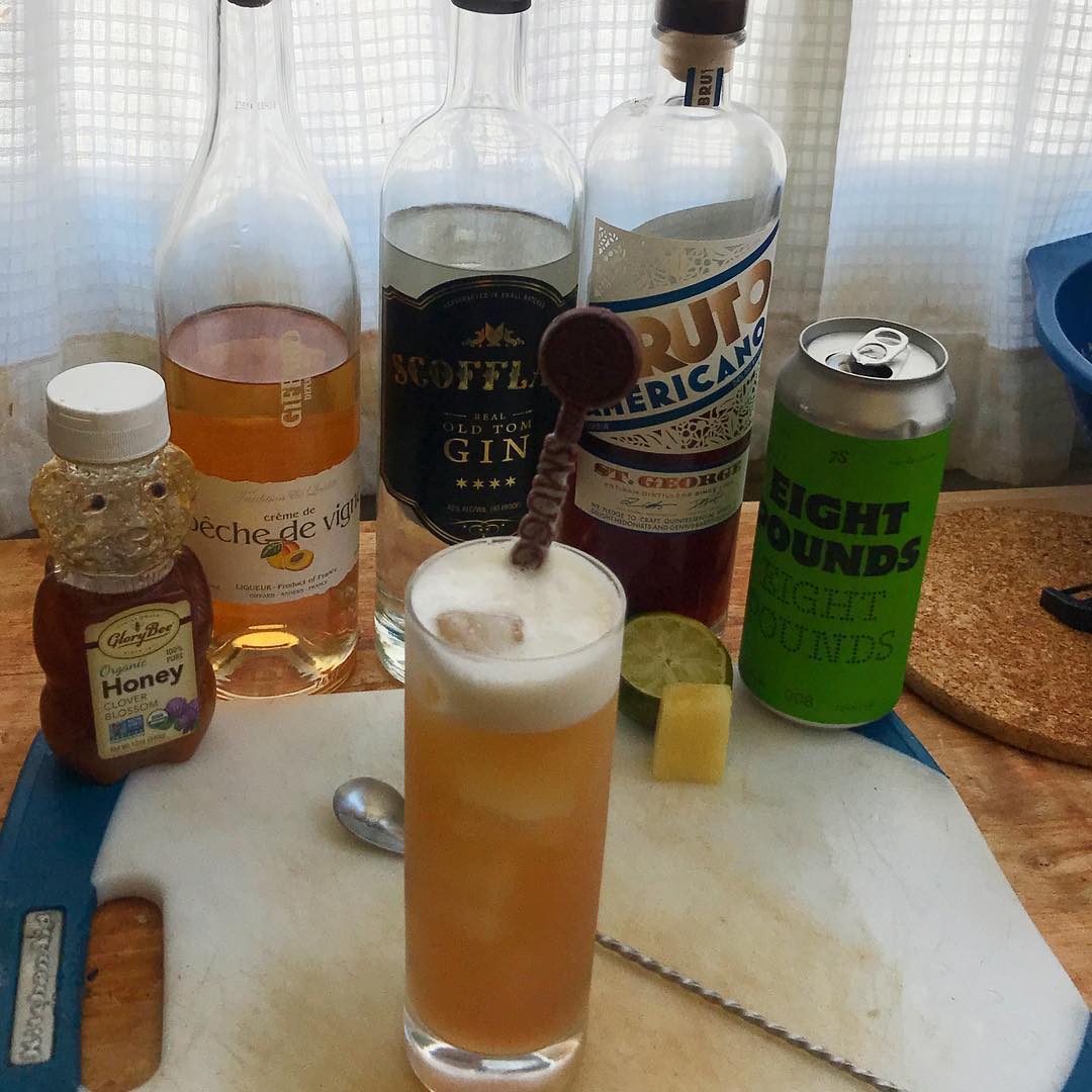 The peach, pineapple, and lime pair very well with the mango notes in the Mosaic-hopped hazy IPA while the bit of juniper and botanicals in the Old Tom gin and the bittersweet notes in the Aperitivo work nicely with the hops in the beer .75 oz Aperitivo of Choice (Campari, St George Bruto, etc)