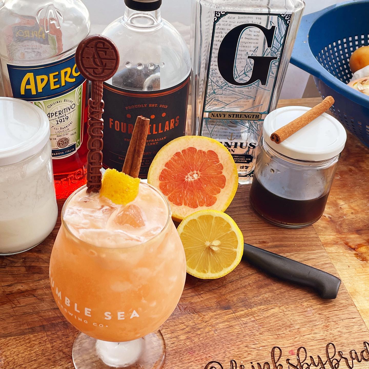 The blend of a citrus-friendly dry Gin and Navy Strength Gin result in a base with notes of juniper, chamomile, and citrus peel that helps highlight the bittersweet grapefruit juice. The dry, yet juicy citrus peel notes of the aperitivo (Aperol) and a squeeze of fresh lemon juice helps boost these notes while cinnamon syrup adds a baking spice note that helps the grapefruit pop while also bridging the botanical and spice notes in the gin to the rest of the drink. Coconut creme adds a rich tropical note that helps smooth the edges of the drink. Excellent for enjoyment on a sunny day!
