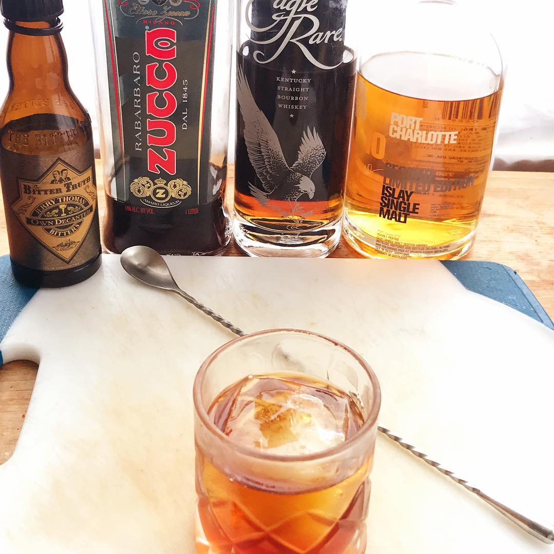 1.5 oz Bourbon .25 oz Islay Scotch (peat-forward offerings like Ardbeg 10, Laphroaig, Bruichladdich Port Charlotte or a peat-forward blend like Compass Box Peat Monster are best)
