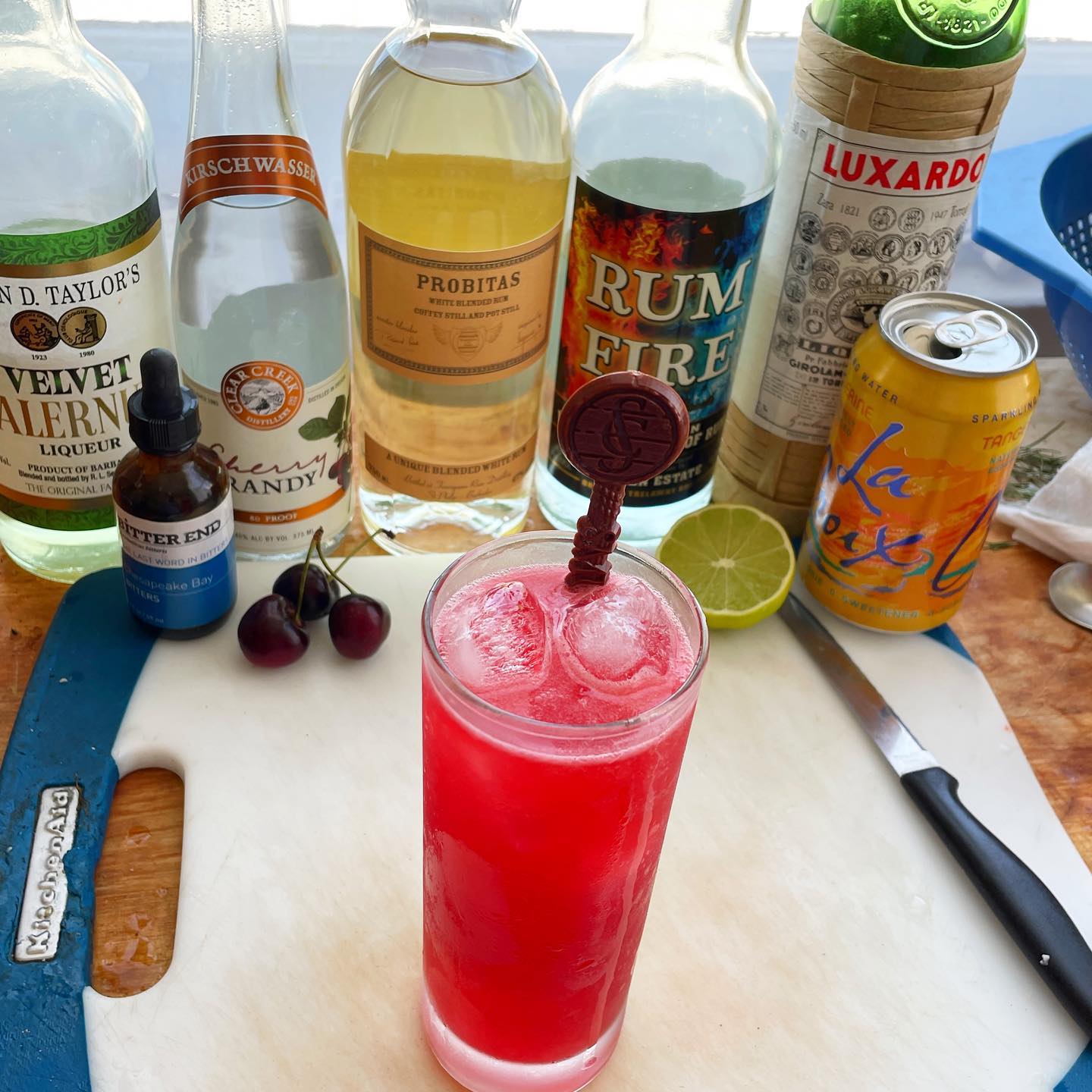 The blend of lightly aged rum and Overproof Jamaican rum work with the cherry eau de vie/Kirschwasser to create a base with power and funk (with plenty of tropical aromas) that help highlight the cherry (from muddled fresh fruit and Maraschino liqueur) and lime flavors. The falernum adds a touch of spice and balancing sweetness while the bitters tie flavors together and bring some notes of Bay leaf and black pepper and the soda water adds effervescence