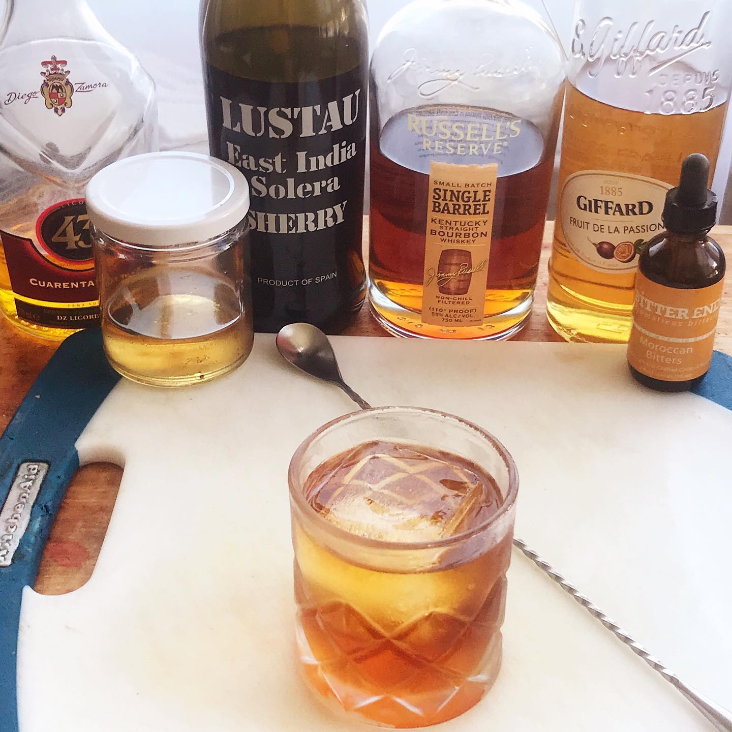 The baking spice and caramel notes in the bourbon work beautifully with the splashes of vanilla liqueur, toffee notes in the sherry, and cinnamon syrup while a bit of passionfruit liqueur, a dash of lemon-y sumac-forward Moroccan Bitters, and the essential oils from a lemon twist bring some tartness and a pleasant aroma