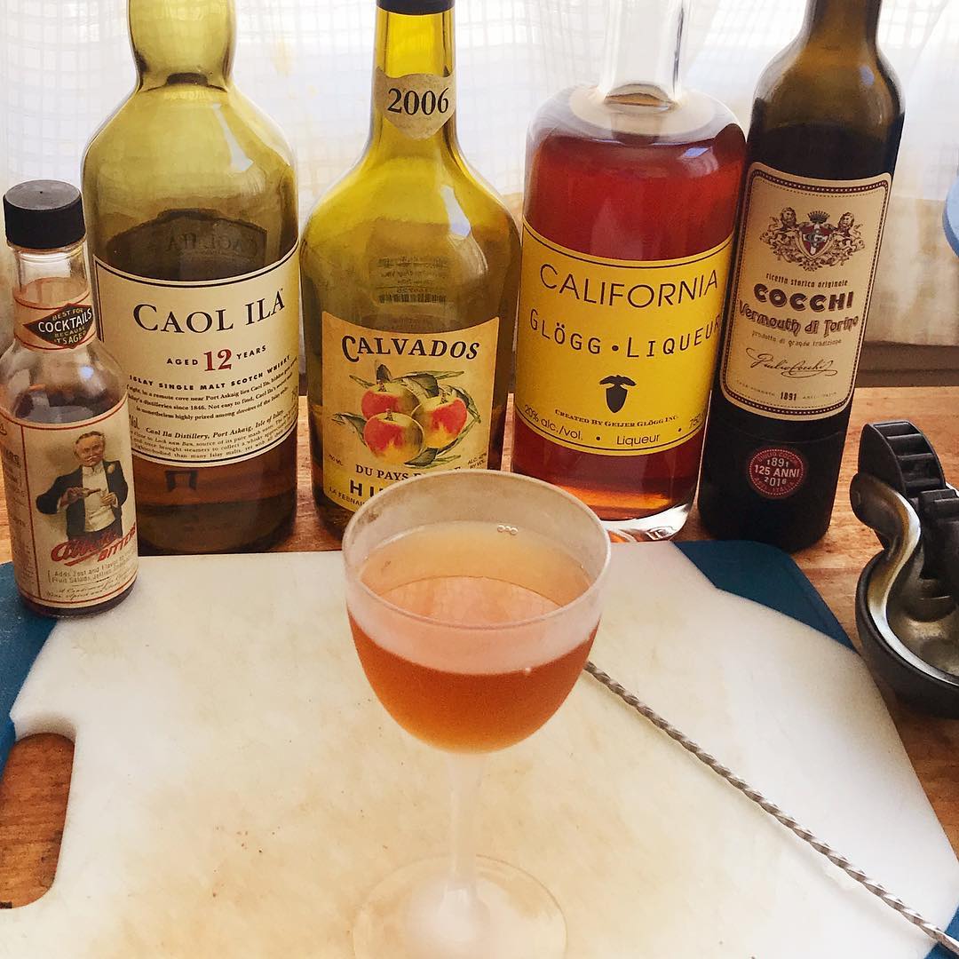 The Calvados lends a delicious apple-forward base that is complemented by the cinnamon/clove/cardamom in the Swedish Glögg liqueur, the subtle cocoa and fruit notes in the Vermouth, and the spices in the bitters. The smoke and hint of sherried sweetness from the Islay scotch give a nice smoky note to each sip