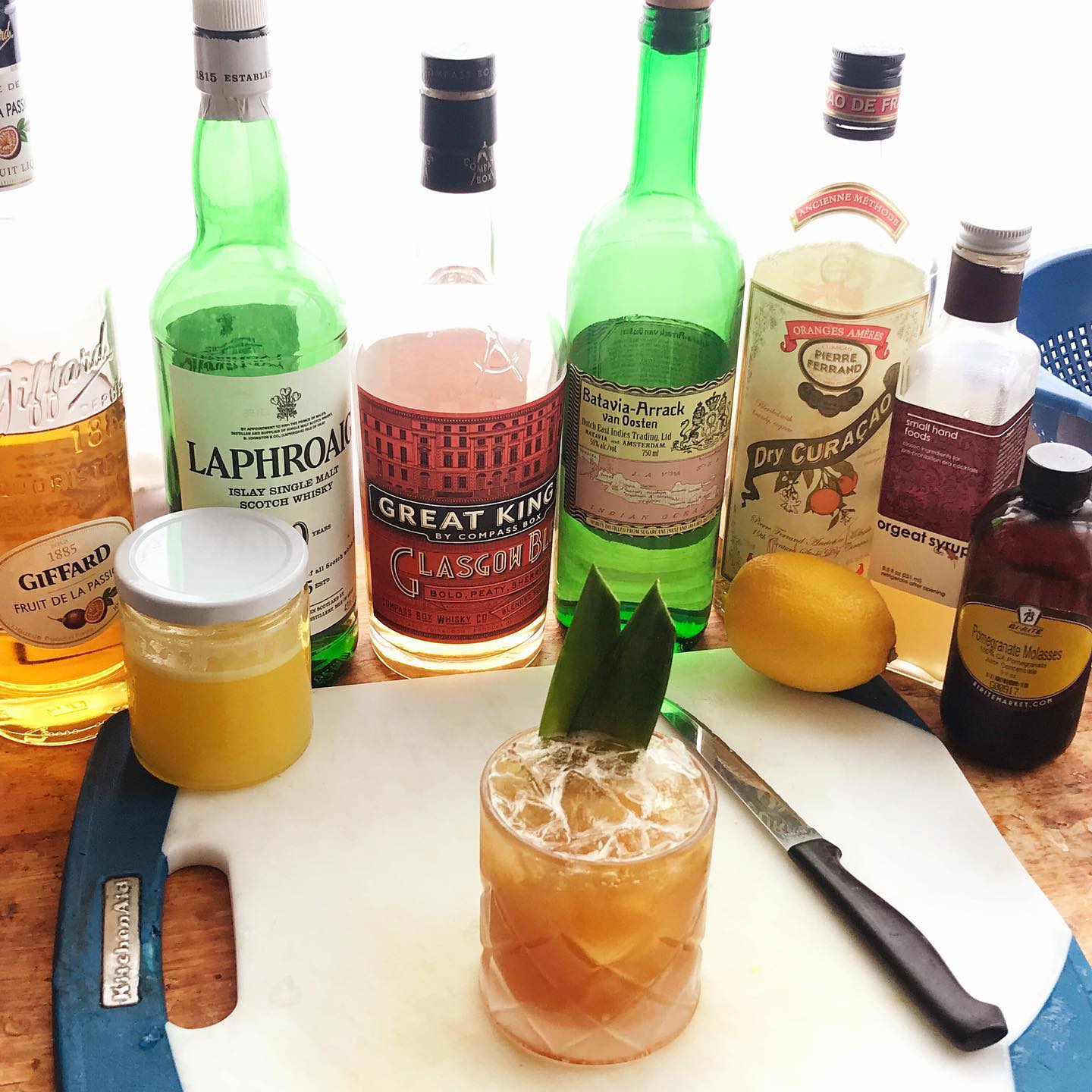A refreshing, nuanced modern riff on a 60s Tiki classic from LA’s Ambassador Hotel from Chicago’s Lost Lake that balances smoke and tropical fruit 🏝🍍🍹 The lightly fruity notes in the blended scotch plays nicely with the tropical pineapple and passionfruit while the sugar cane/red rice-based Batavia Arrack and Islay scotch bring some funky flavor and smoke. The curaçao lends orange notes and the fresh lemon adds bright citrus while the nutty orgeat smoothes out the edges and the splash of pomegranate molasses adds depth