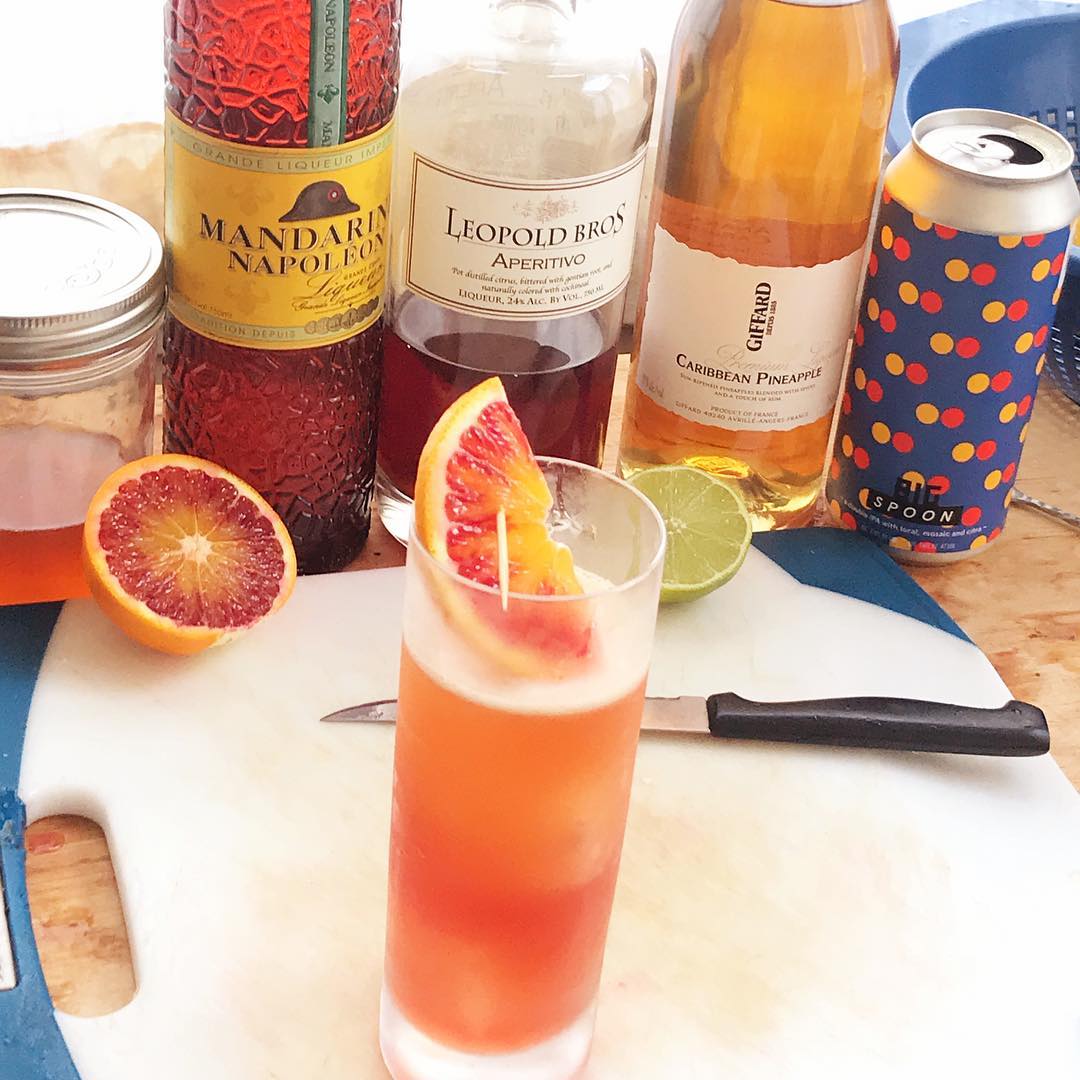 The peak season blood orange marries very nicely with the juicy bitterness of the Aperitivo/Campari while the orange and pineapple liqueurs pair wonderfully with the tropical flavors in the nice, hazy IPA