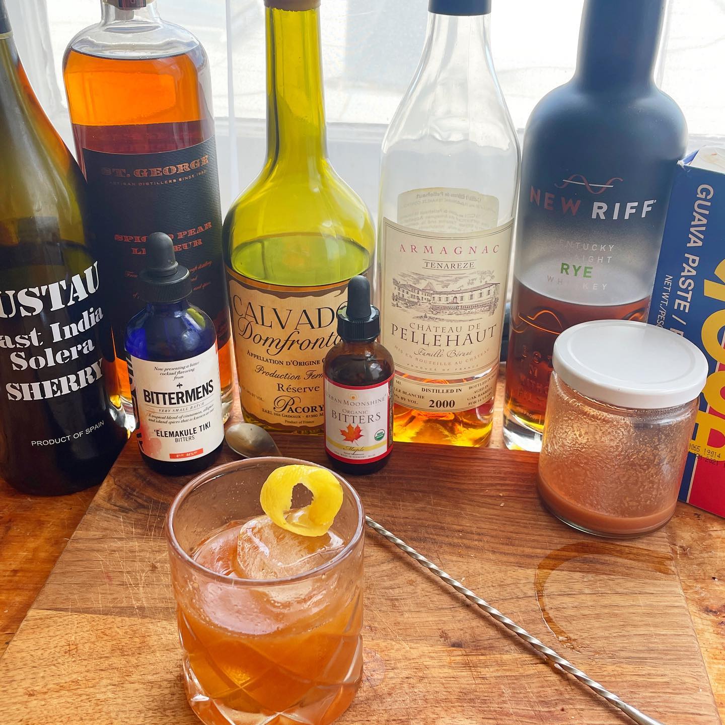 The apple and pear notes in the Calvados (French brandy distilled from orchard fruits), the caramelized sugar, baking spice, and fruit notes in the aged Armagnac (French brandy from Gascogne region) and the vanilla and baking spice notes in the Bonded Rye combine to create a rich and fruity base that works in great harmony with the floral and fruit notes found in the guava syrup. Splashes of rich, nutty Sherry and spiced pear liqueur boost the orchard fruit and baking spice notes while also adding a note of candied nuts. The dashes of bitters add complementary notes of ginger, cinnamon and rich maple syrup. A delicious autumnal after-dinner sipper
