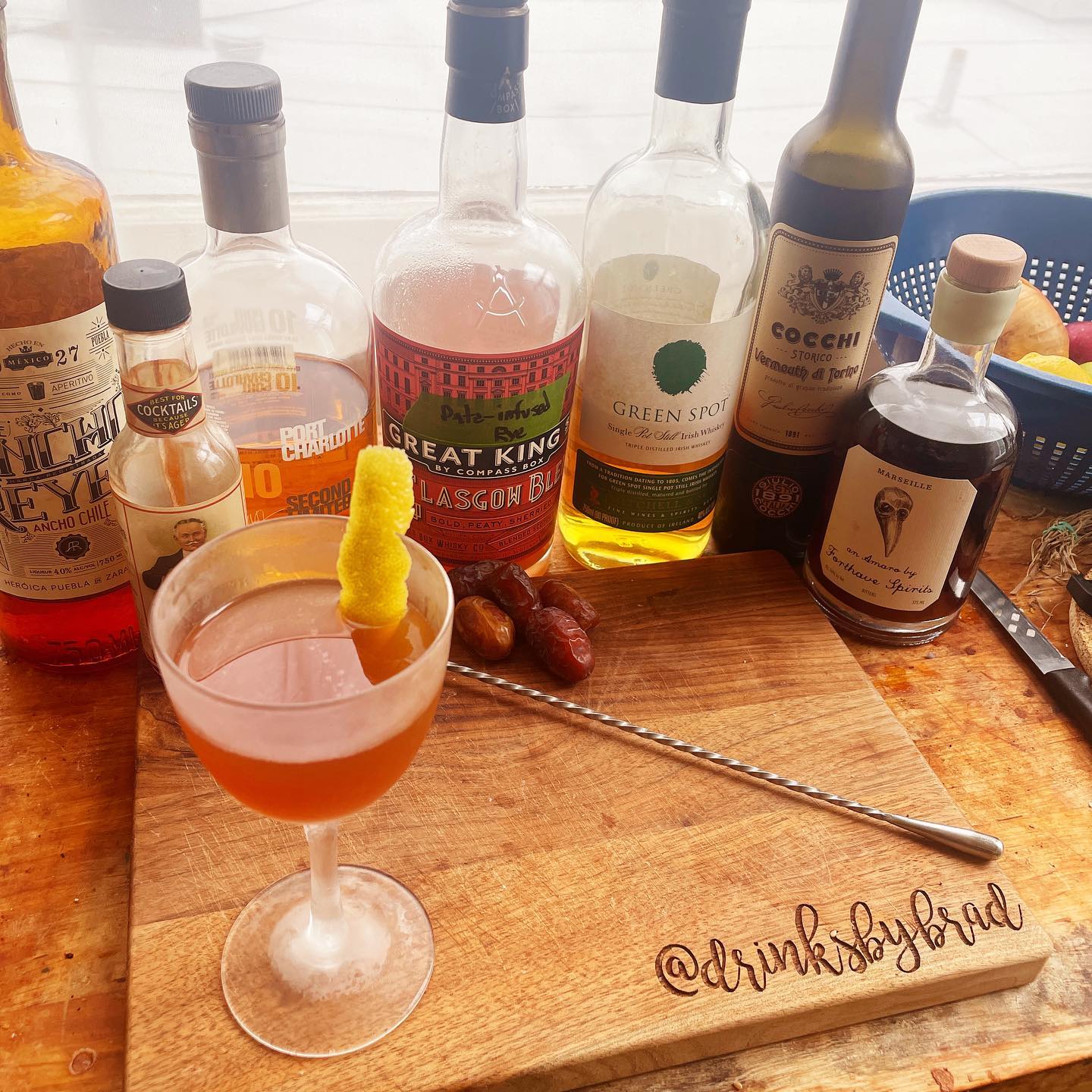The baking spice and vanilla notes in the Rye whiskey work nicely with the rich, sweet notes of the fresh dates. Additions of Irish whiskey and Islay scotch add complementary notes of honey, cereal grain, rich sherry, and a touch of smoke to evoke cleaning up fallen leaves. Additions of small amounts of Forthave Marseille Amaro and ancho chile liqueur add complexity via their bittersweet honey/eucalyptus and red chile spice to the red fruit and cocoa notes in the sweet vermouth to help tame the whiskies. A few dashes of Aromatic bitters help boost the baking spice notes while the essential oils from the lemon twist adds a bright citrus aroma to each sip