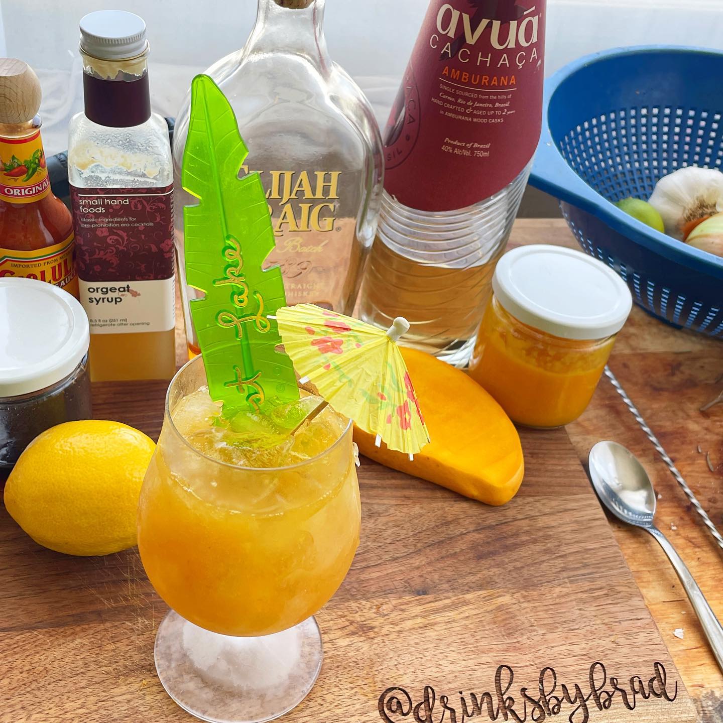 The mix of bourbon and aged cachaca results in a base with notes of vanilla, baking spice, and tropical fruit that accentuates the sweet/floral flavors in the ripe mango. Fresh lemon juice adds some zippy citrus, hot sauce adds some spice, and the almond notes in the orgeat helps add body while taming the heat a little and complementing the spirit base and mango. A delicious sunny afternoon drink!