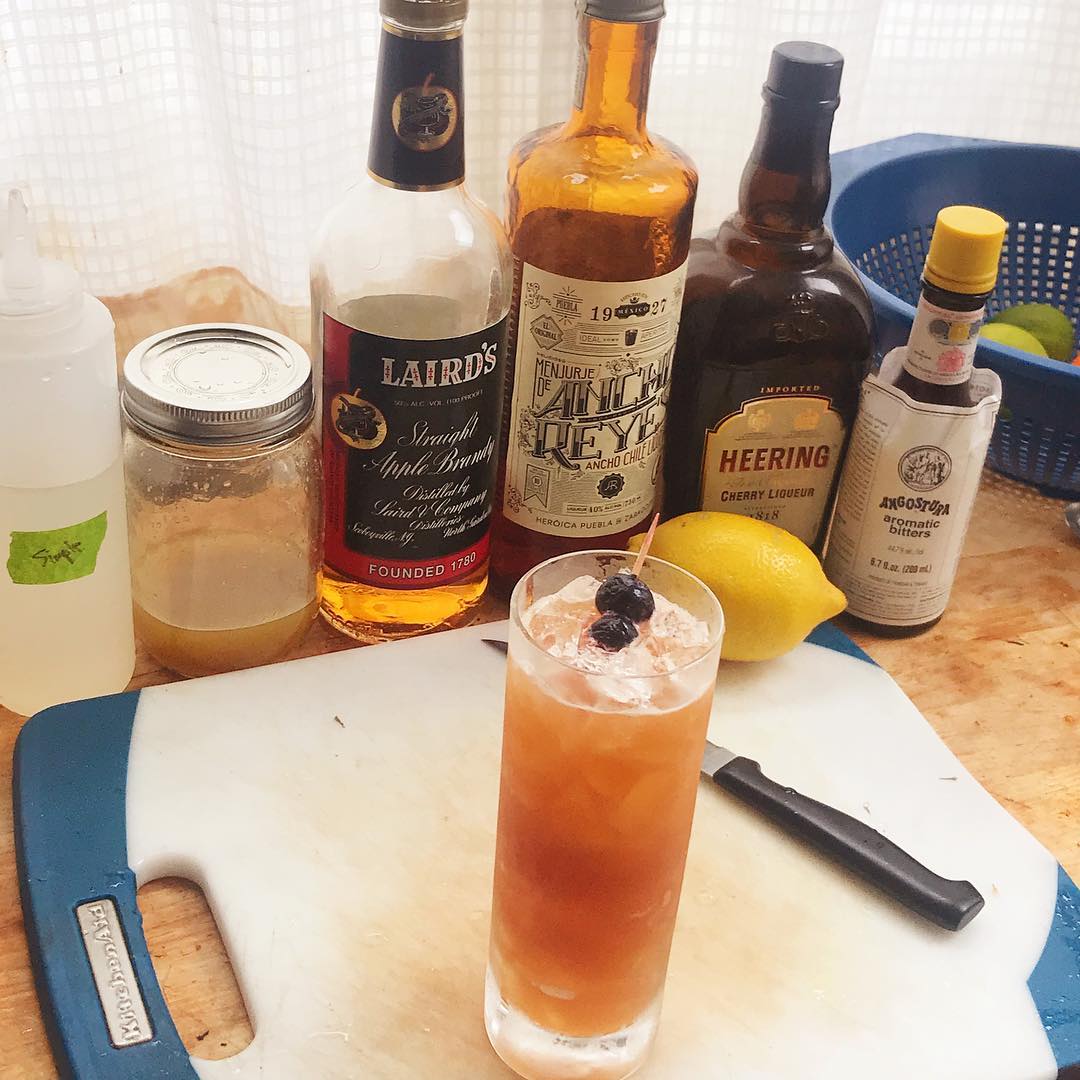 The ancho chili liqueur, ginger syrup, and Angostura ensure that each sip has a spicy finish while the Cherry Heering contributes some fruity sweet notes, the Apple Brandy provides oomph and some rich apple flavor accents, and the lemon cuts the sweetness