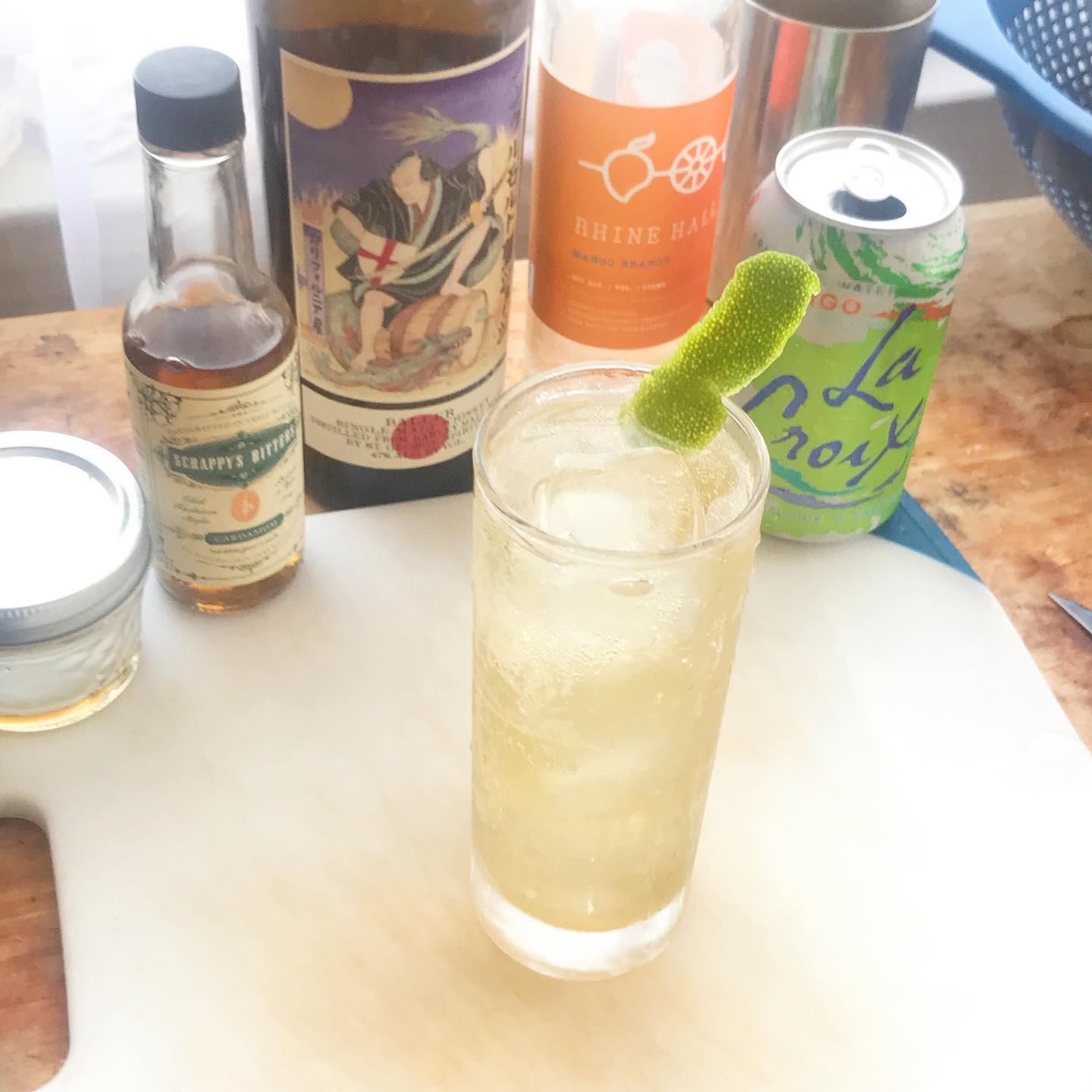 Top with Soda Water (about 6 oz; Mango LaCroix here, but Lime, Berry, or Natural would also work) and garnish with a lime twist