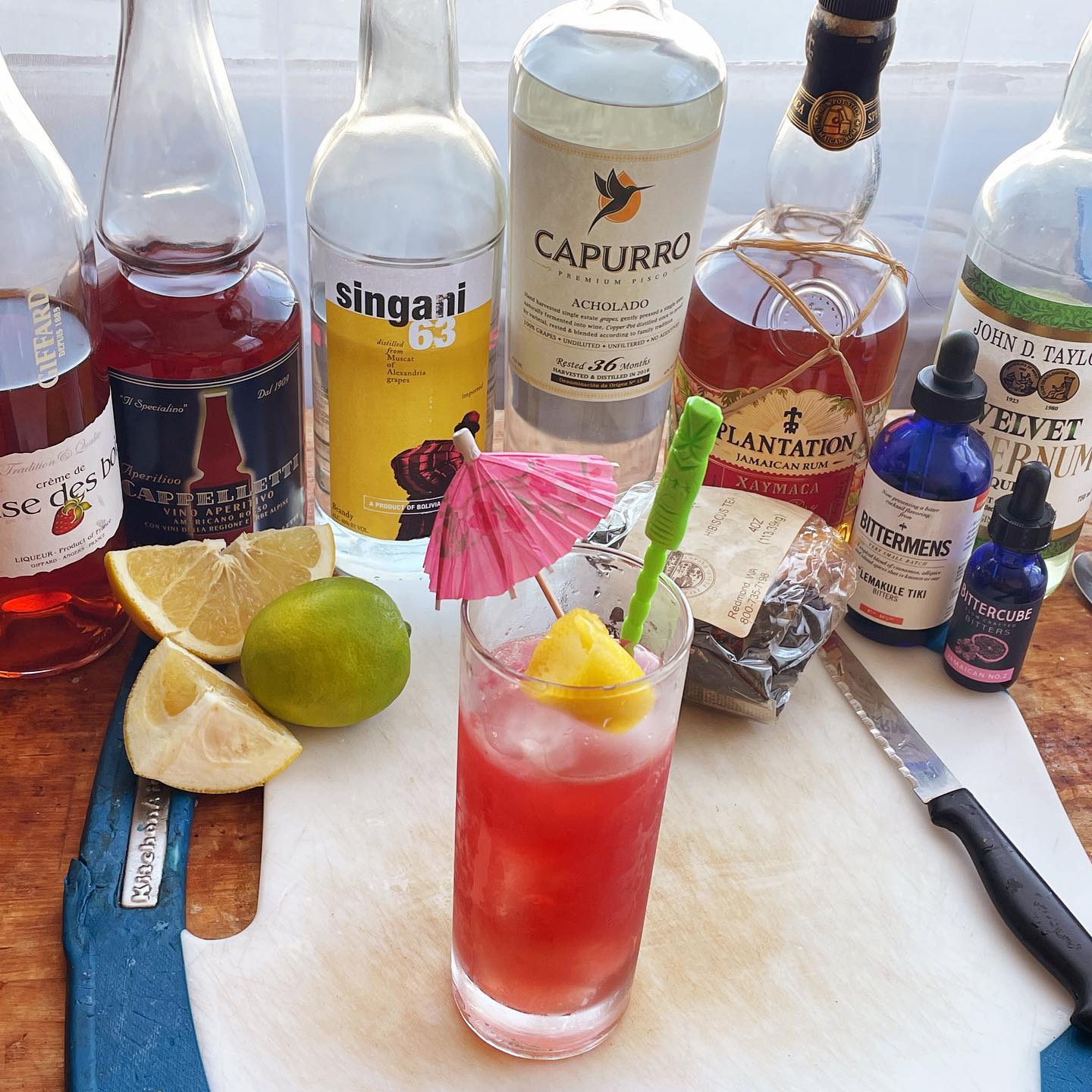 The blend of South American brandies (Pisco from Chile and Singani 63 from Bolivia) creates a base brimming with grape and floral notes that is enhanced by the hibiscus tea-infused funk of the Jamaican rum. The Cappelletti adds a bittersweet note that helps bridge the grapefruit and lime citrus flavors while the splashes of Strawberry liqueur, Falernum, and bitters and complementary spice and fruit notes. A delicious sipper for a winter weekend afternoon