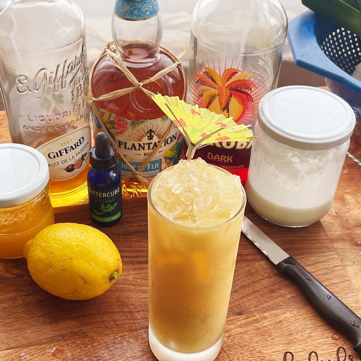 The mix of lightly aged Fijian Rum and Dark Jamaican rum forms a base with notes of molasses, caramelized sugar, and rum raisin that complements the tropical flavors in the mango purée and the rich coconut creme. A healthy squeeze of fresh lemon juice adds balancing acidity and the passionfruit liqueur and Jamaican bitters boost the tropical fruit flavor while adding some complementary allspice and ginger undertones