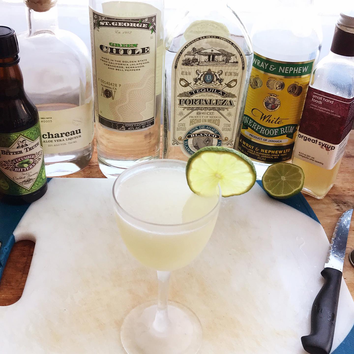 The herbal and citrus notes in the Blanco tequila work very well with the green chile notes in the vodka, the cucumber and the melon notes in the Aloe Vera liqueur. The splash of overproof rum adds a little bit of funky depth while the lime brings bright citrus notes that work nicely with the green produce flavors, the orgeat rounds down the vegetal edges and the cucumber bitters boost those garden spa notes. Very refreshing after a long day of work